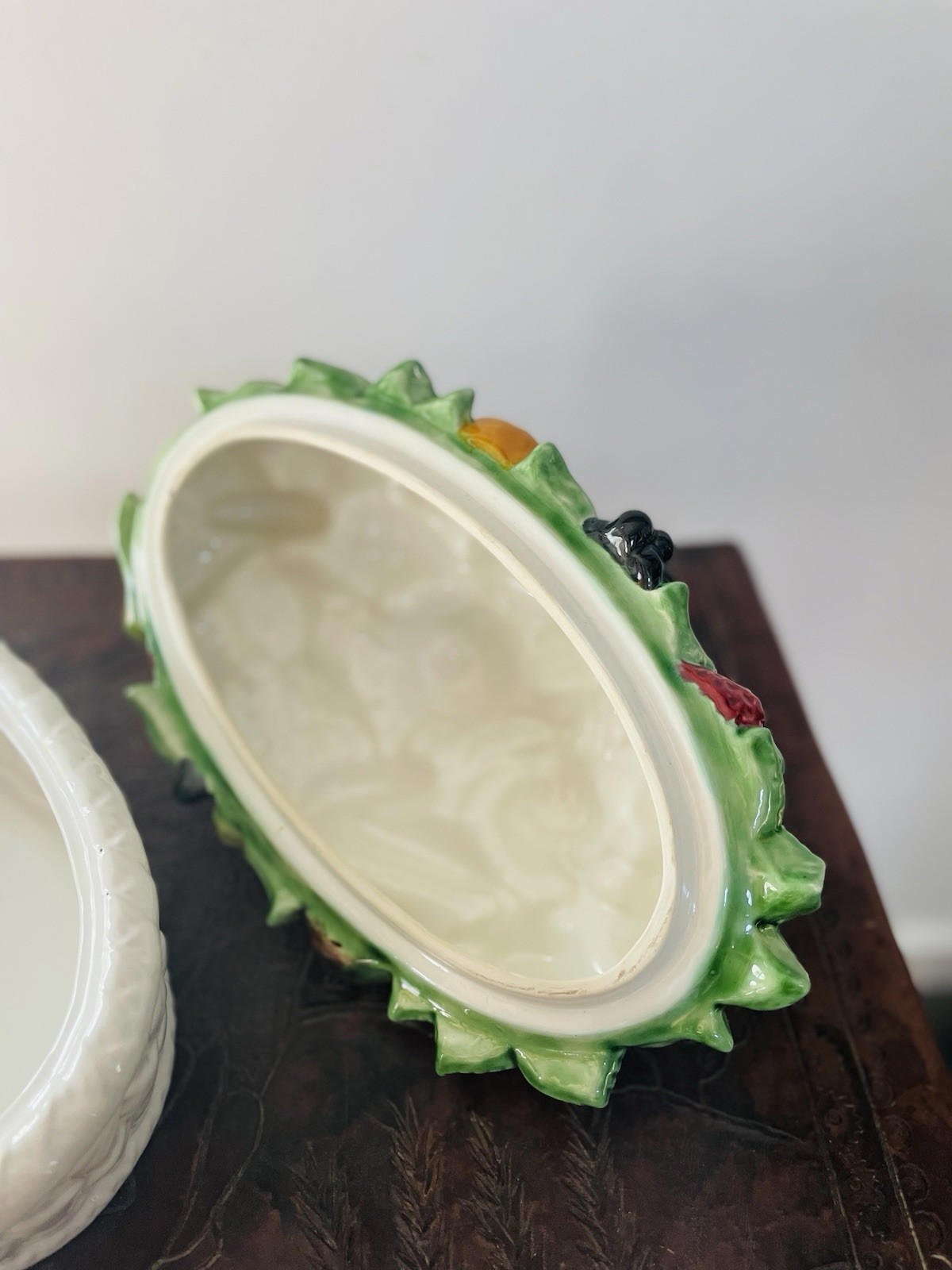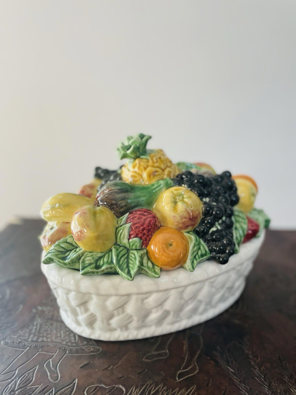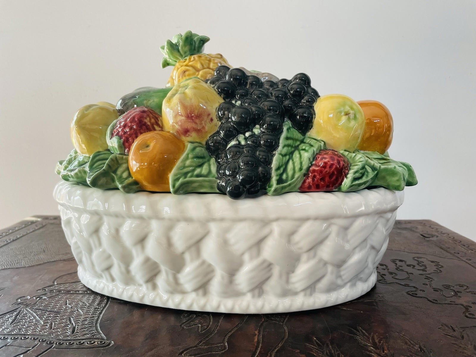 This vintage Bordallo Pinheiro fruit basket is a rare find, made in Portugal and perfect for all occasions. The oval shape and glossy finish make it a stylish addition to any home, while the decorative lid and vintage pattern add a touch of charm. Crafted from porcelain, this two-piece set includes a bowl with a fruit theme that is sure to impress. Whether you're a collector or just looking for a unique piece of art deco style, this original vintage bowl is a must-have.