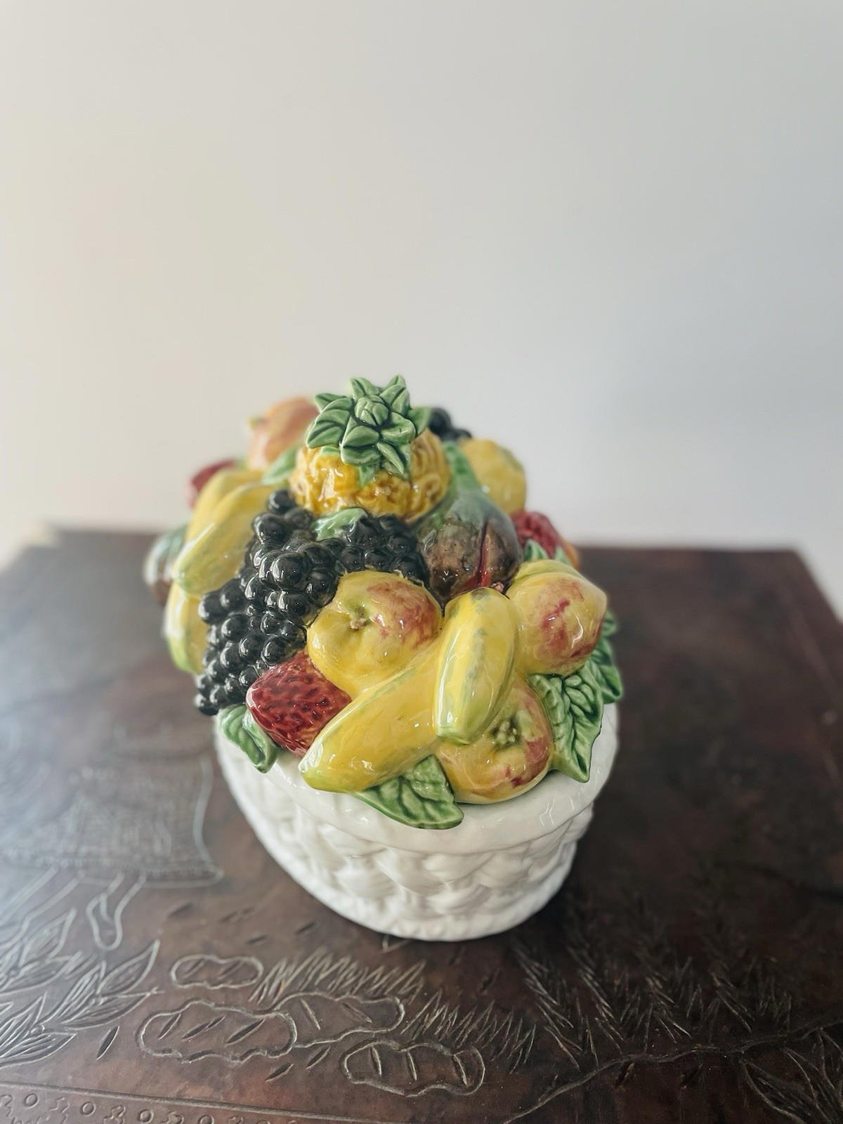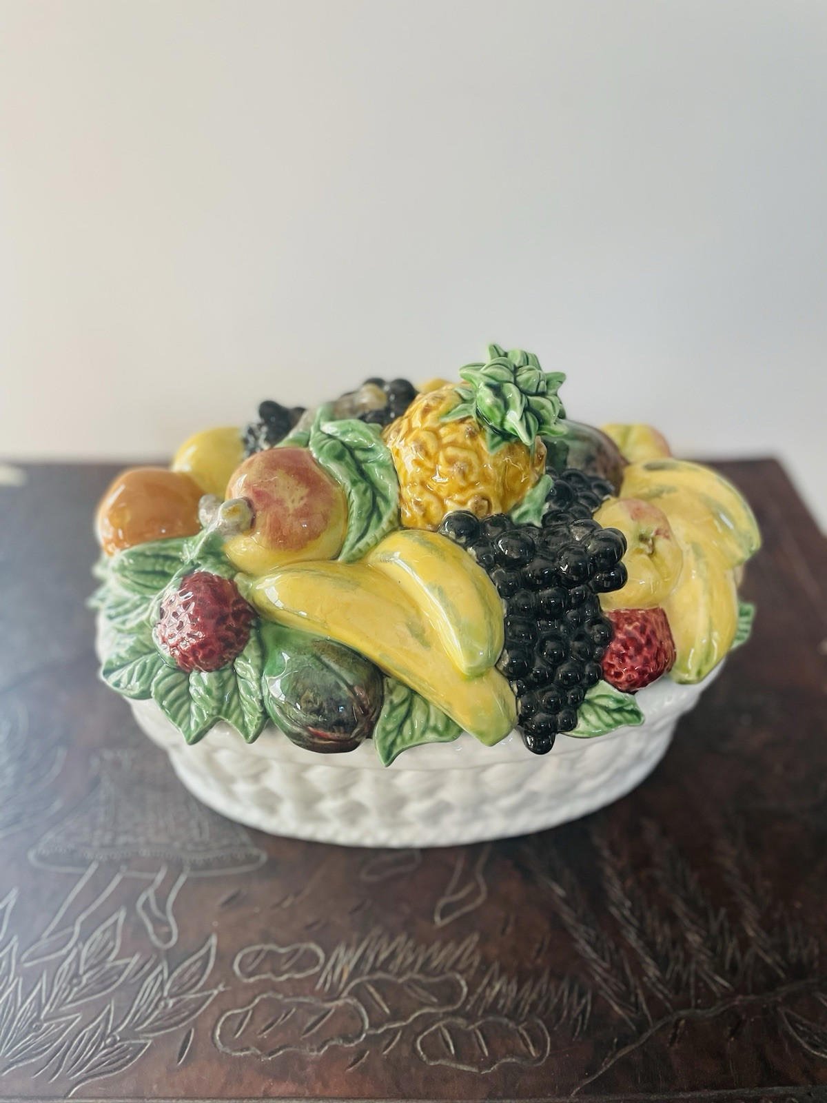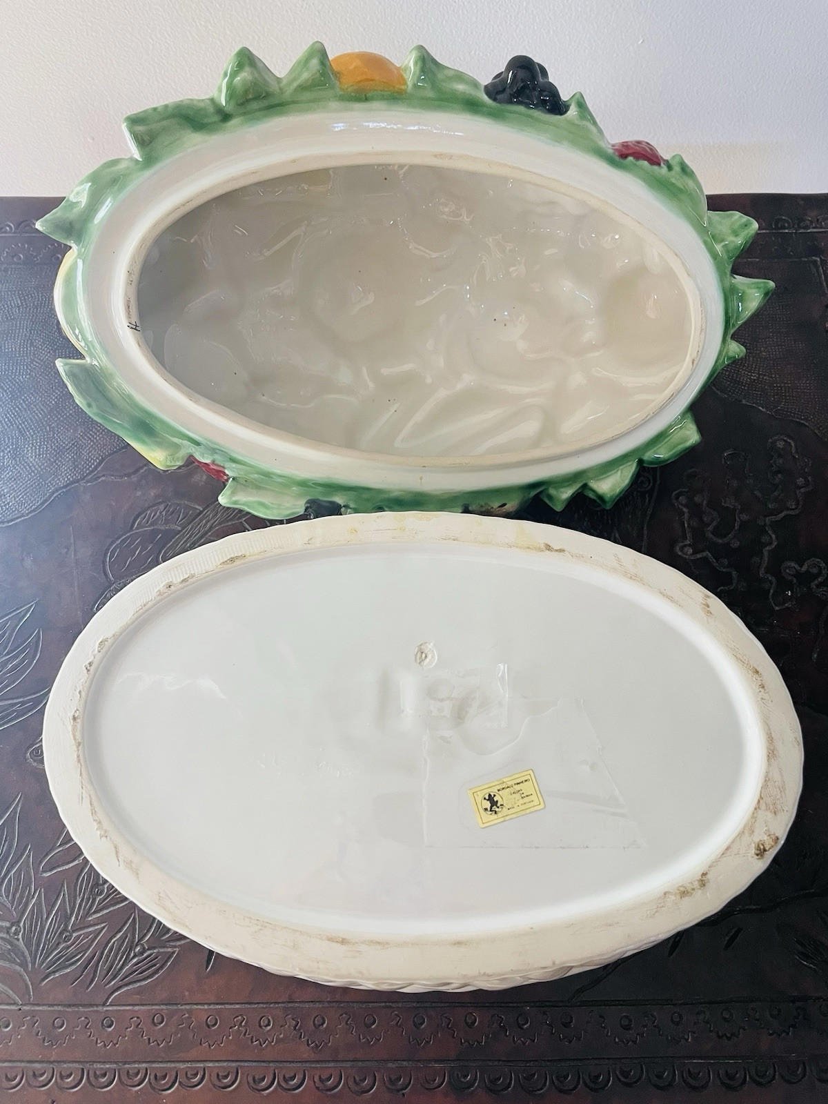 This vintage Bordallo Pinheiro fruit basket is a rare find, made in Portugal and perfect for all occasions. The oval shape and glossy finish make it a stylish addition to any home, while the decorative lid and vintage pattern add a touch of charm. Crafted from porcelain, this two-piece set includes a bowl with a fruit theme that is sure to impress. Whether you're a collector or just looking for a unique piece of art deco style, this original vintage bowl is a must-have.