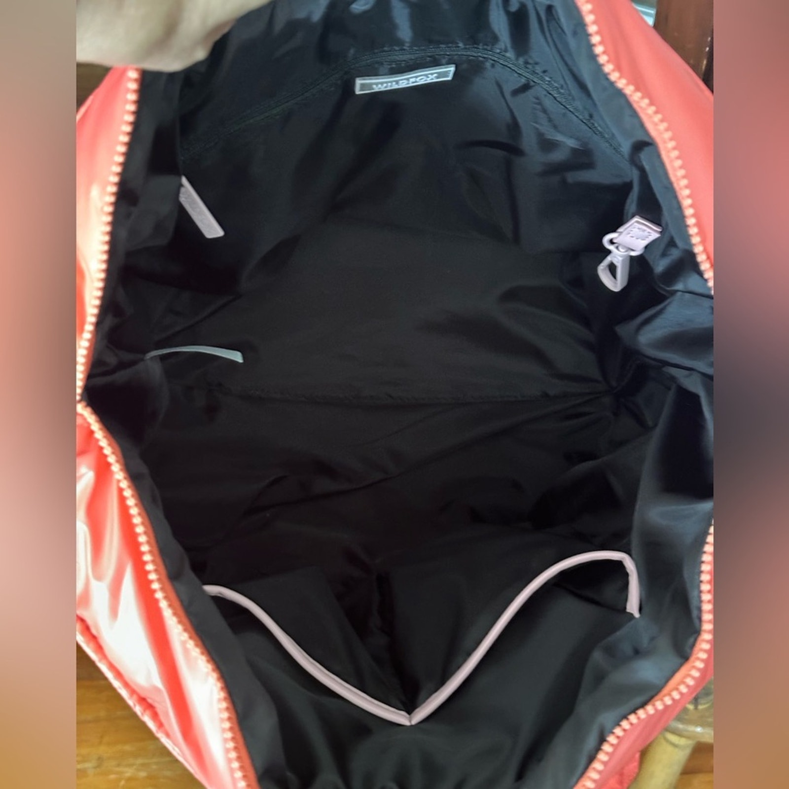 Super soft in peach with pink lips all over. This large tote is cute and convenient with an inside hook for your keys