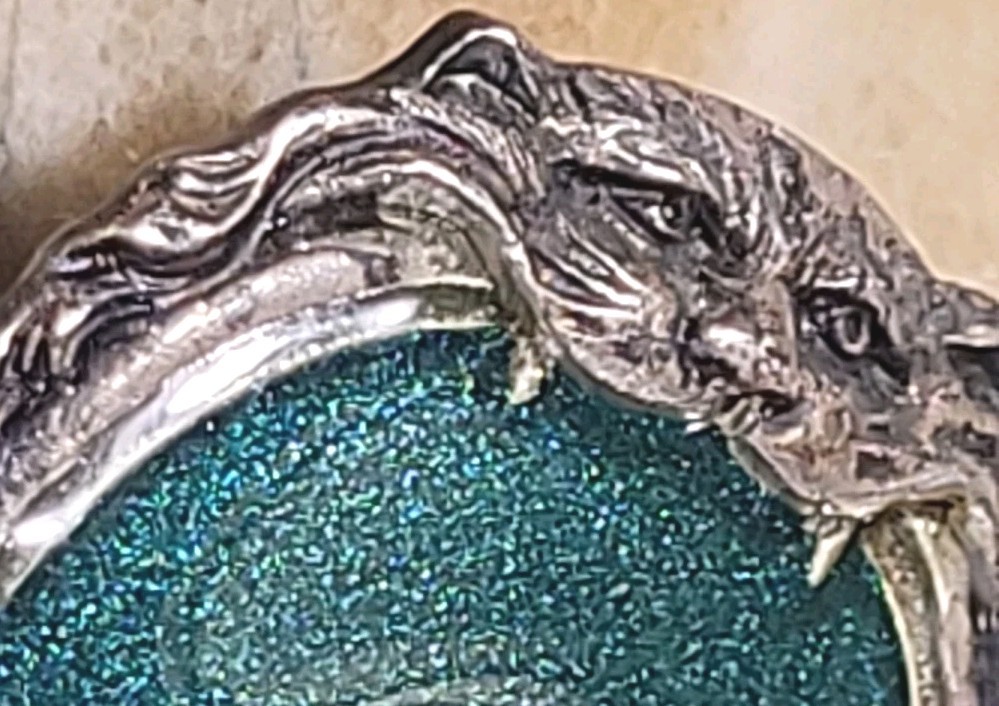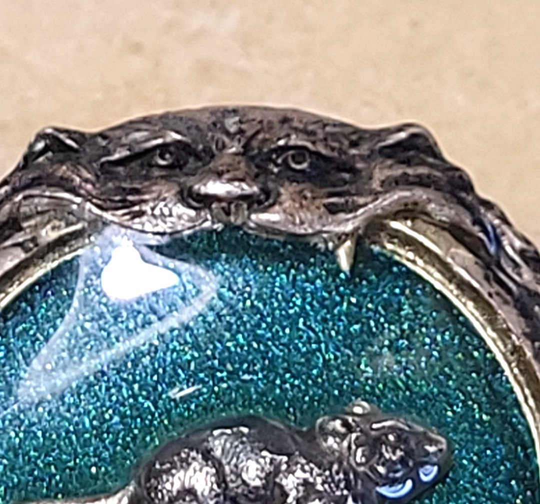 Front of brooch shows perspective of cat's open mouth. Back of the brooch shows the perspective of being inside the cats mouth. Pure genius!