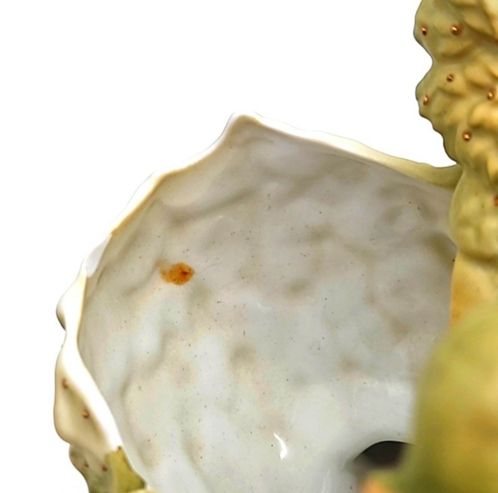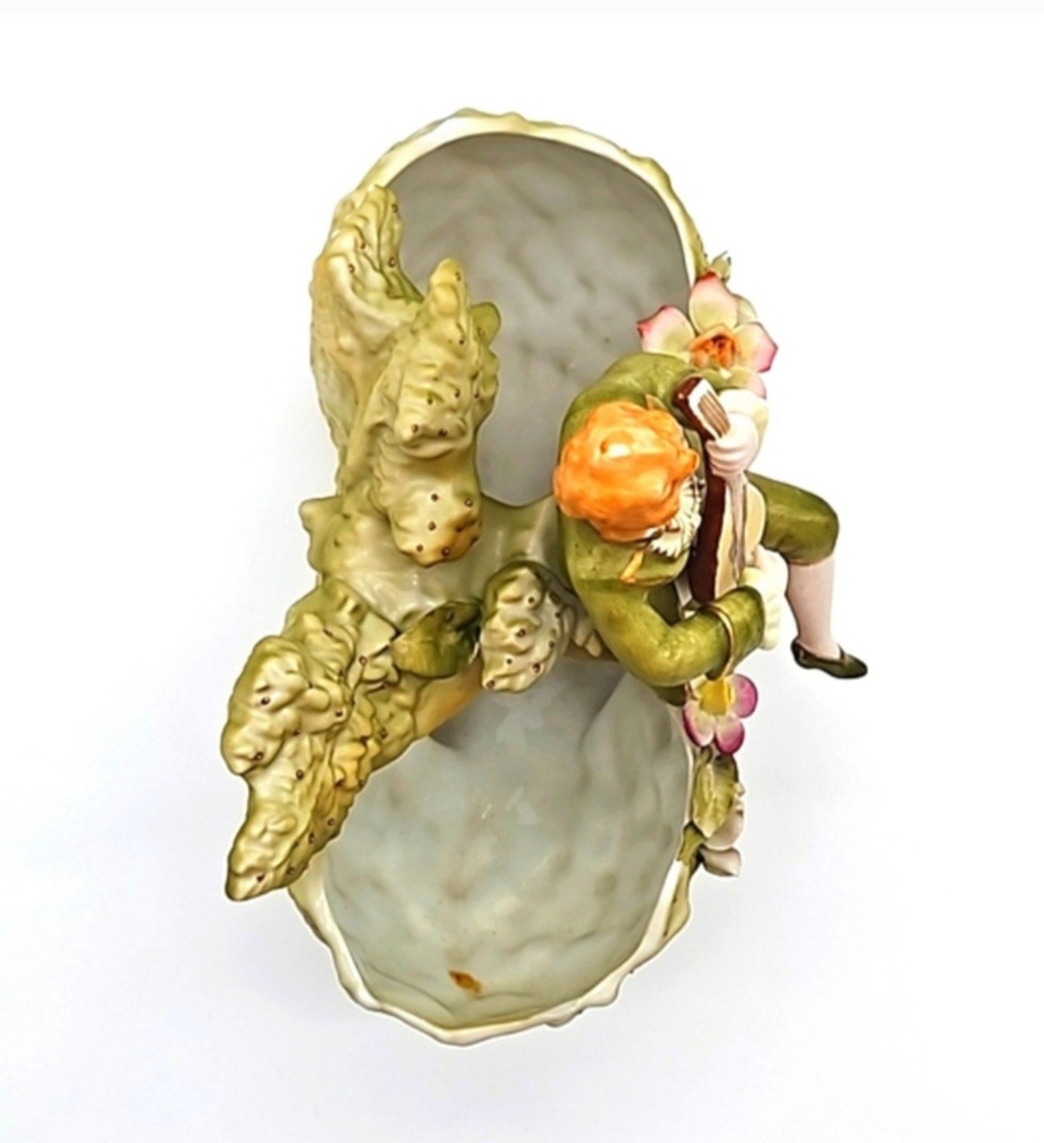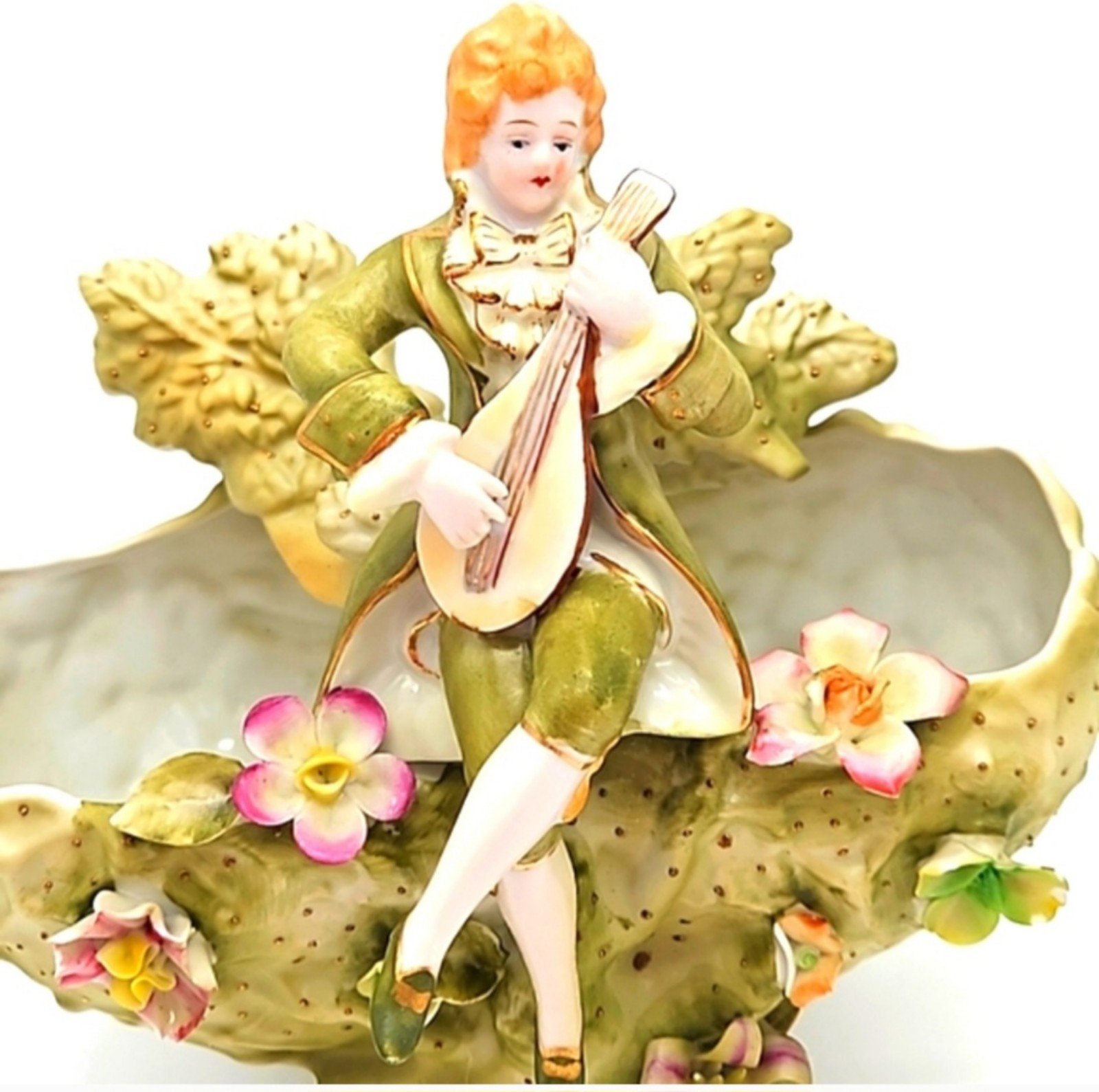 Vintage porcelain Art Nouveau musician boy figurine. Unknown manufacturer or era. Marked with G493 on bottom. There are a few small pieces of flowers that have broken off (see last 2 pics), and a small orange stain inside left bowl, but otherwise the piece is in excellent condition! It has been used in the past as both a vase for a floral arrangement and as a soap dish.