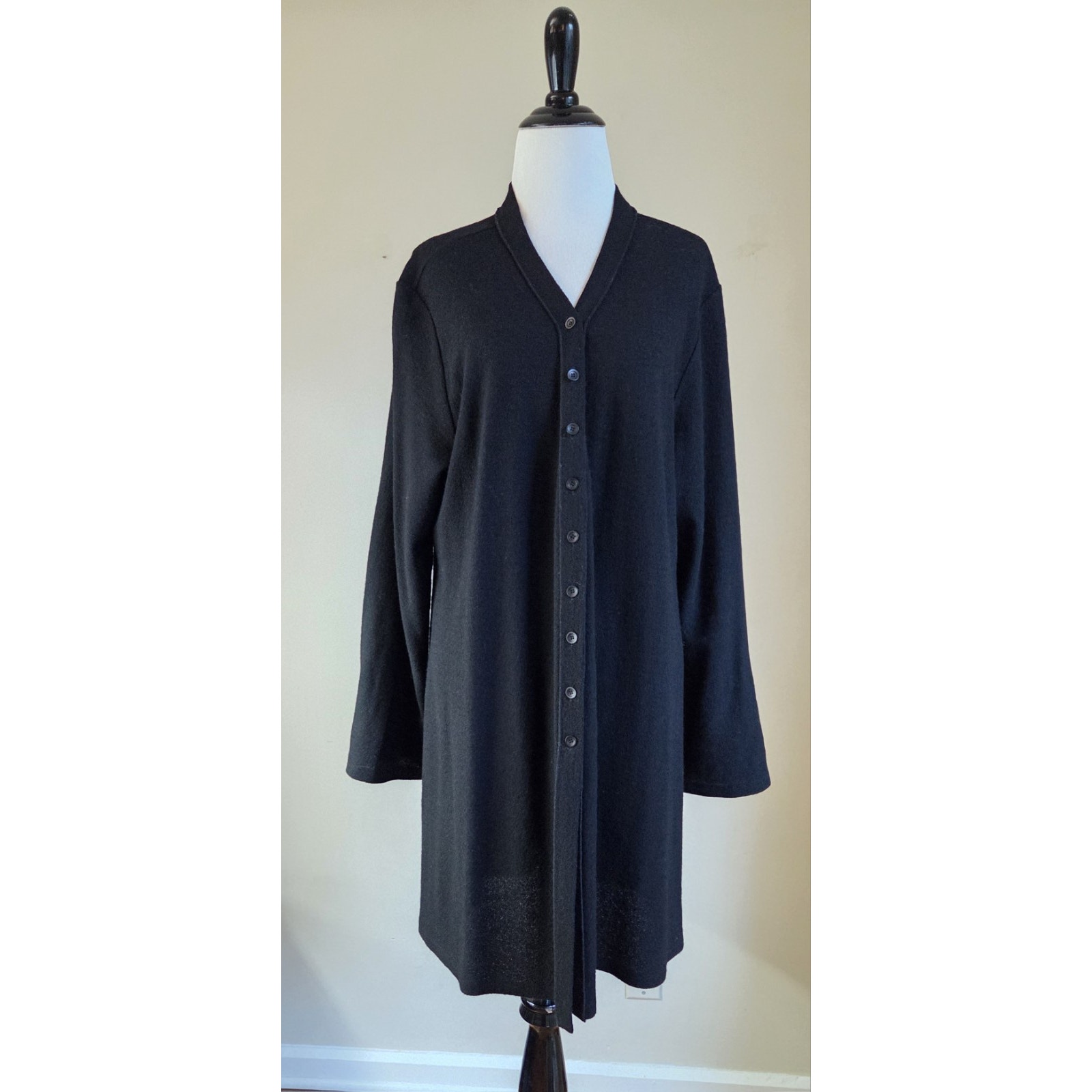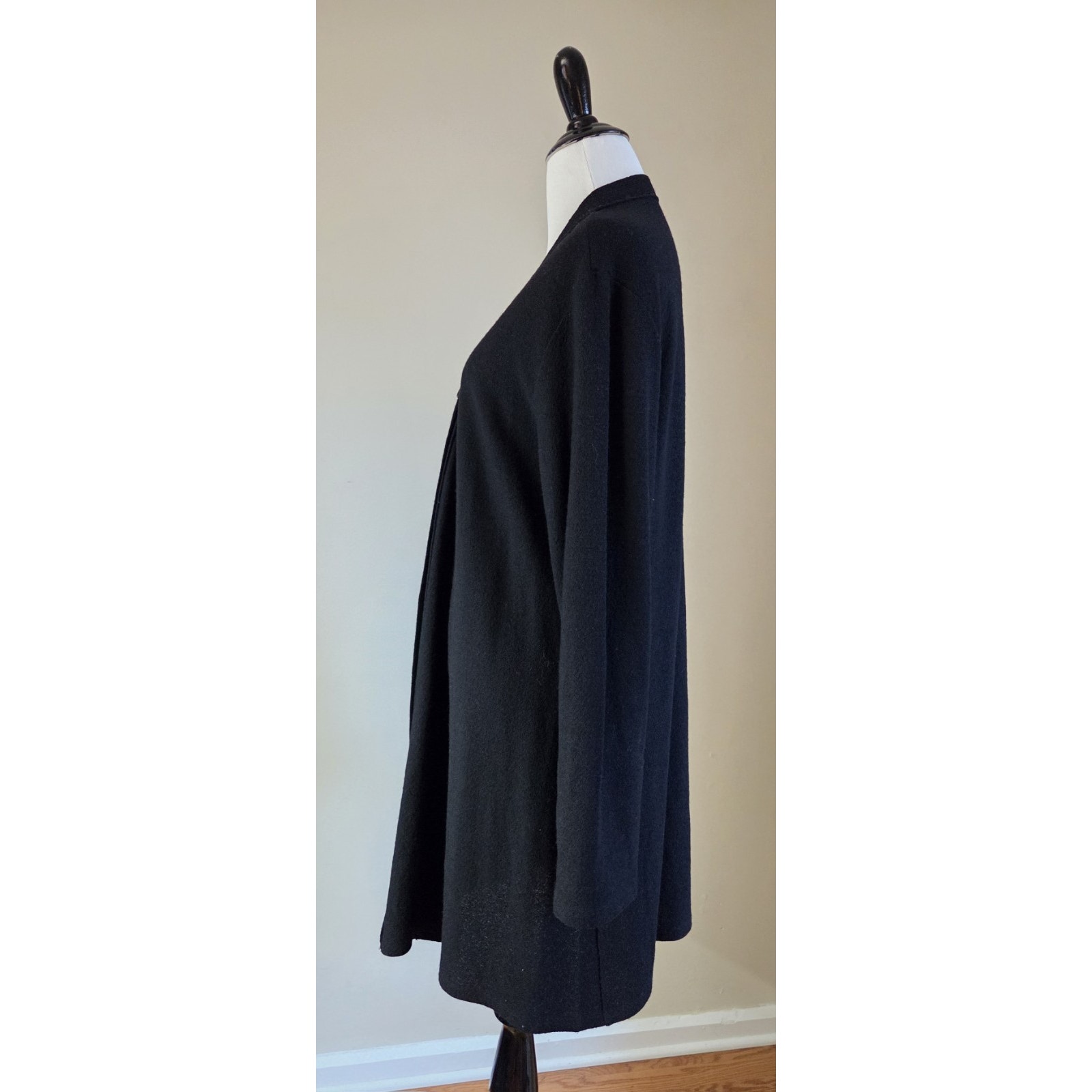 This Eileen Fisher long cardigan sweater in black is made from 100% wool, making it a luxurious and warm addition to any woman's wardrobe. With a classic v-neckline and button accents, this XL size cardigan is perfect for layering over a variety of outfits. The long sleeves offer extra comfort and style, making it a versatile piece that can be dressed up or down for any occasion. Ideal for those looking for a timeless and elegant sweater that will elevate their look.
