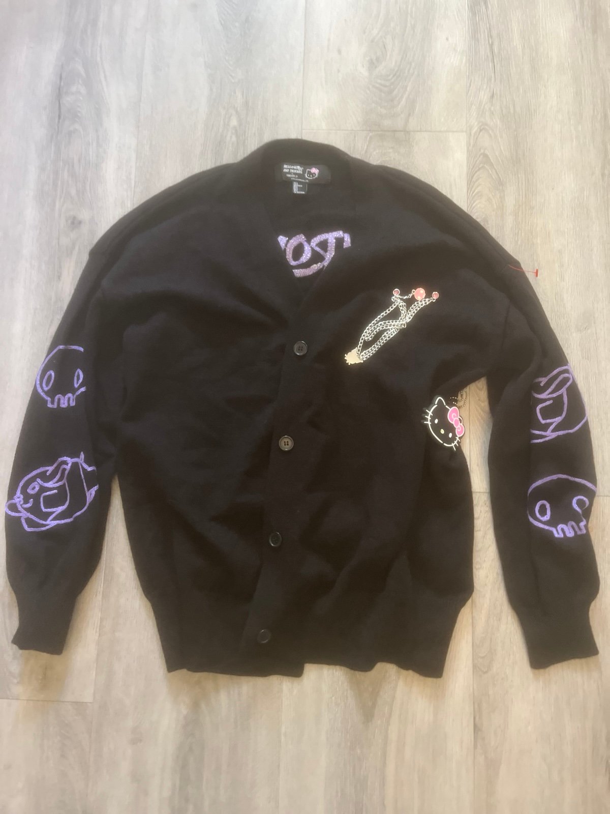 The Forever 21 x Hello Kitty & Friends Knit Kuromi Chain Black Cardigan in size Medium is a stylish and playful addition to any woman's wardrobe. This sweater features a cute character, Kuromi, from the Friends series and is made in a cozy knit fabric. The black color adds a versatile touch to this cardigan, making it easy to