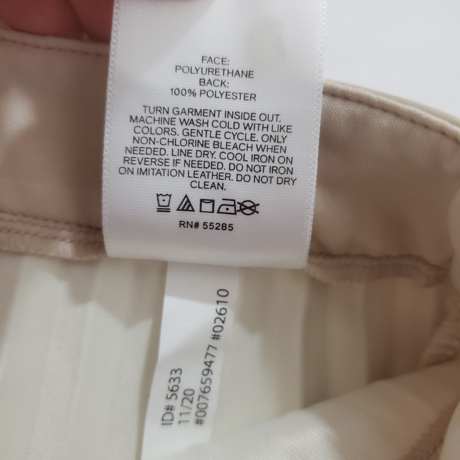 This is a short skirt from Express in Faux Leather fabric. Cream neutral color. Pleated. Back zip closure. Skater / a-line silhouette.