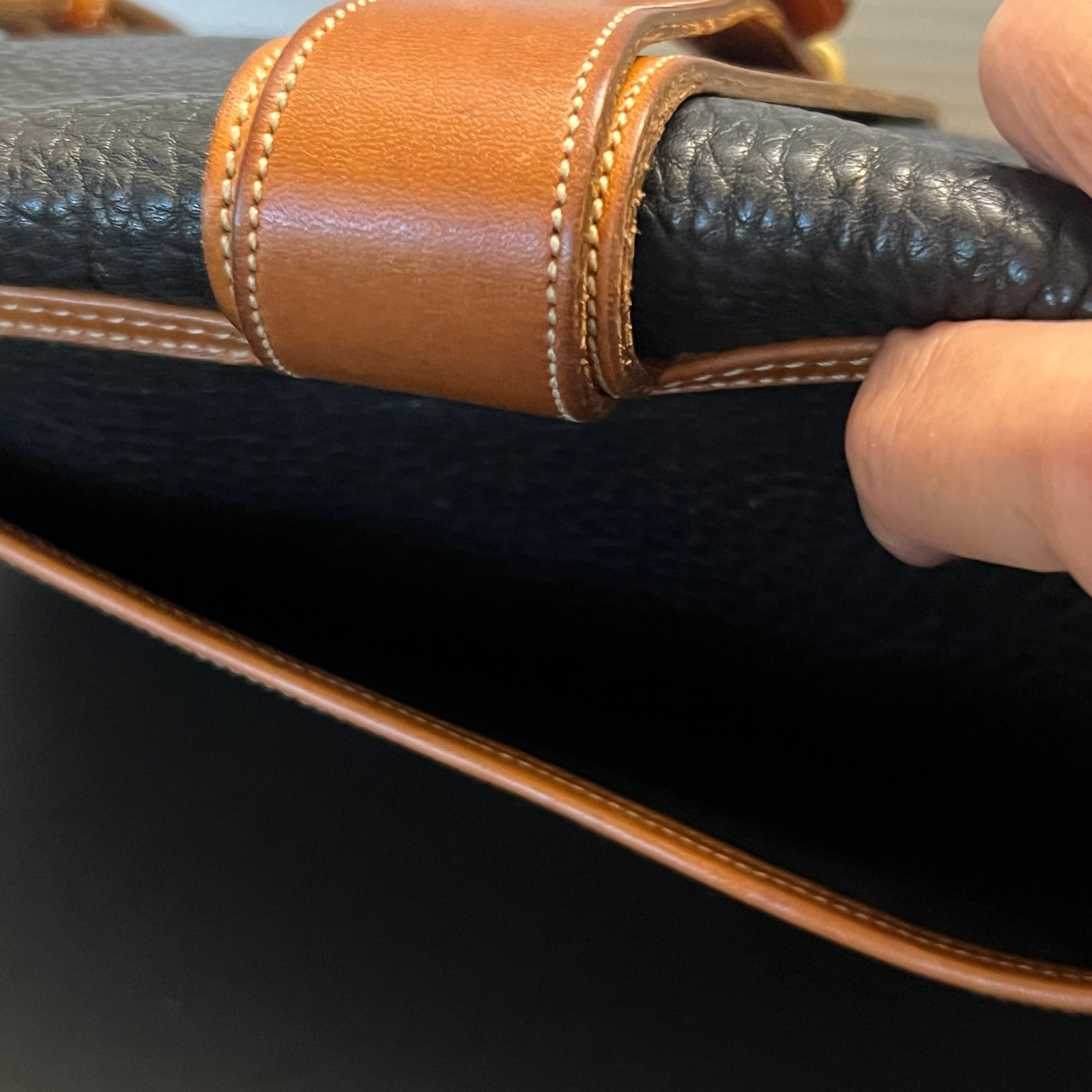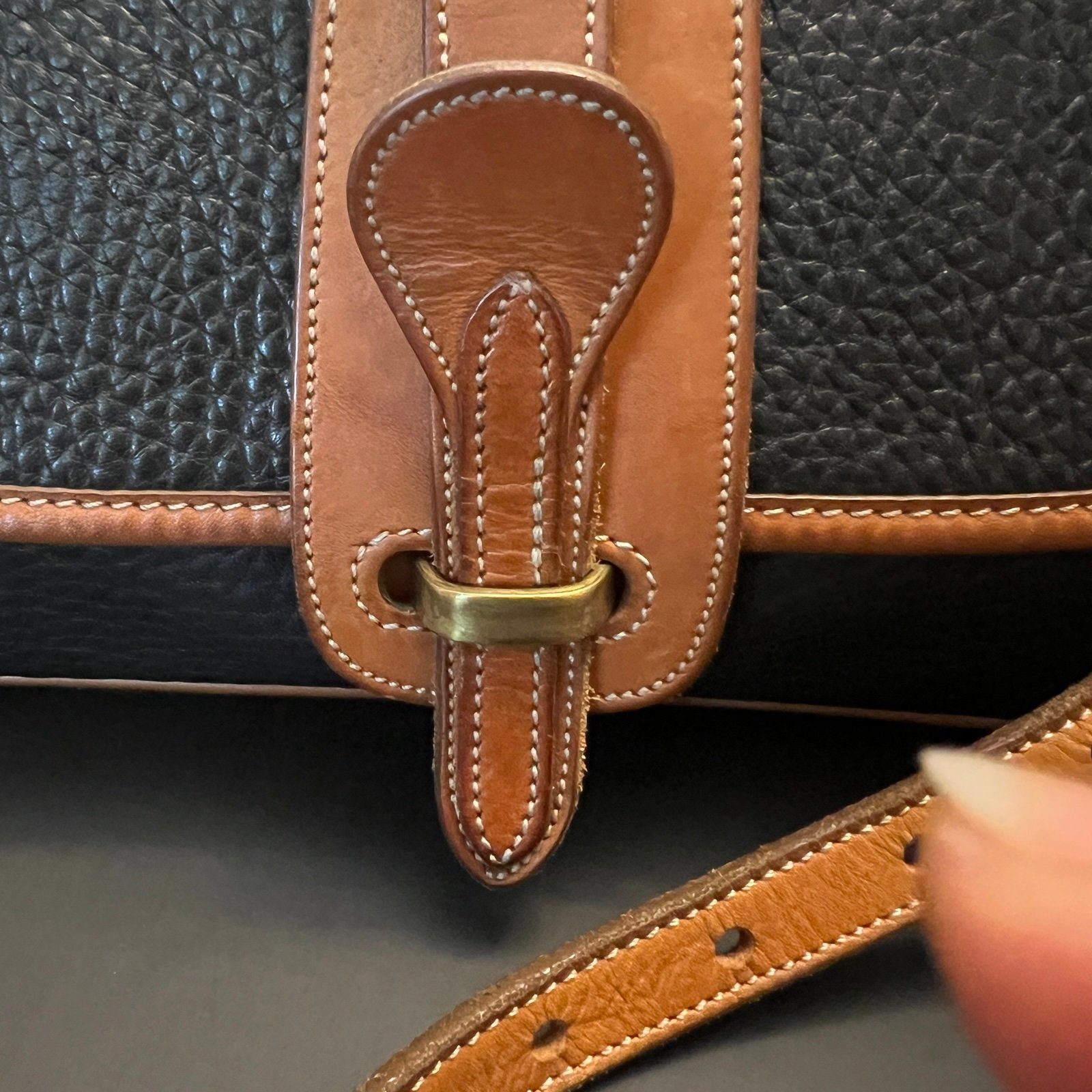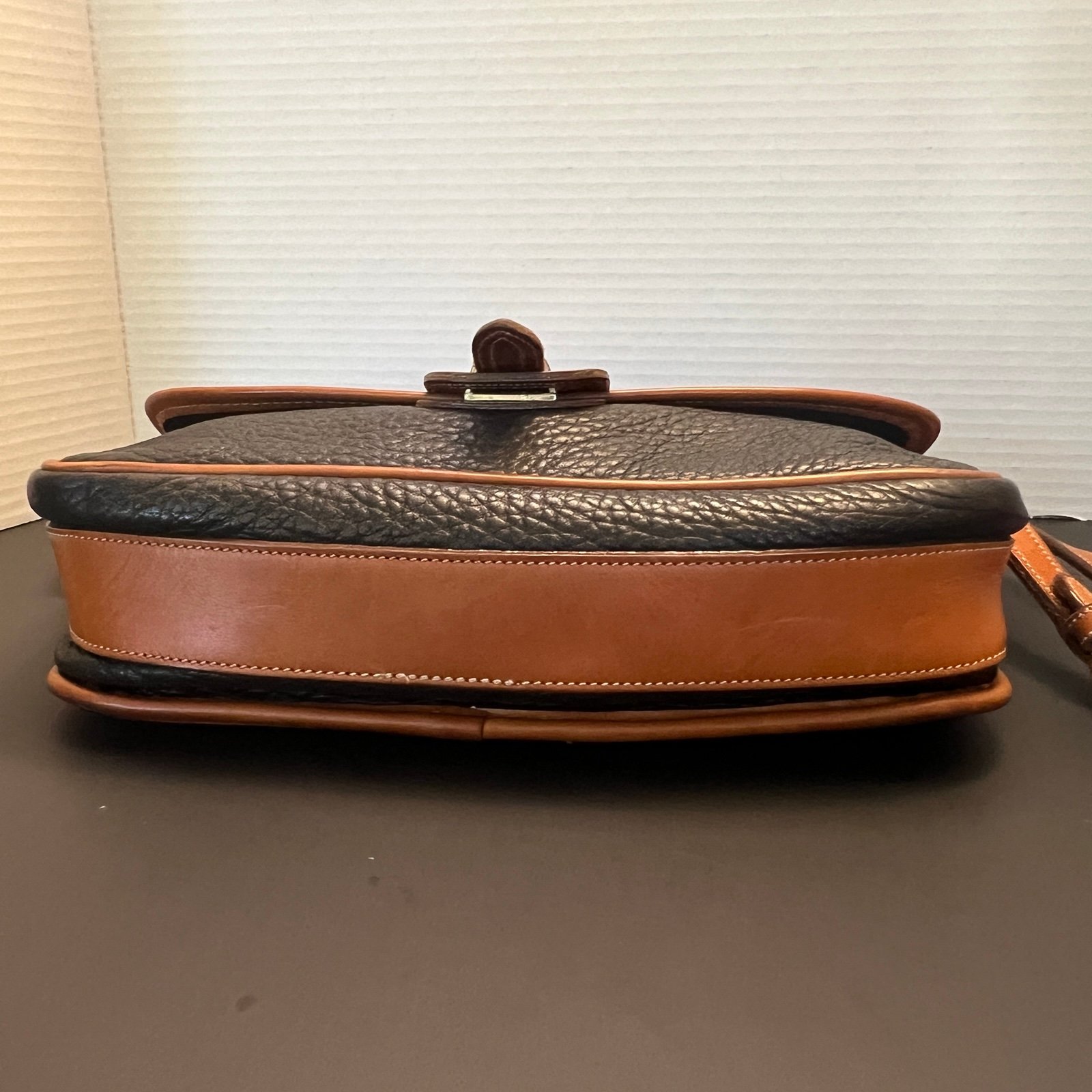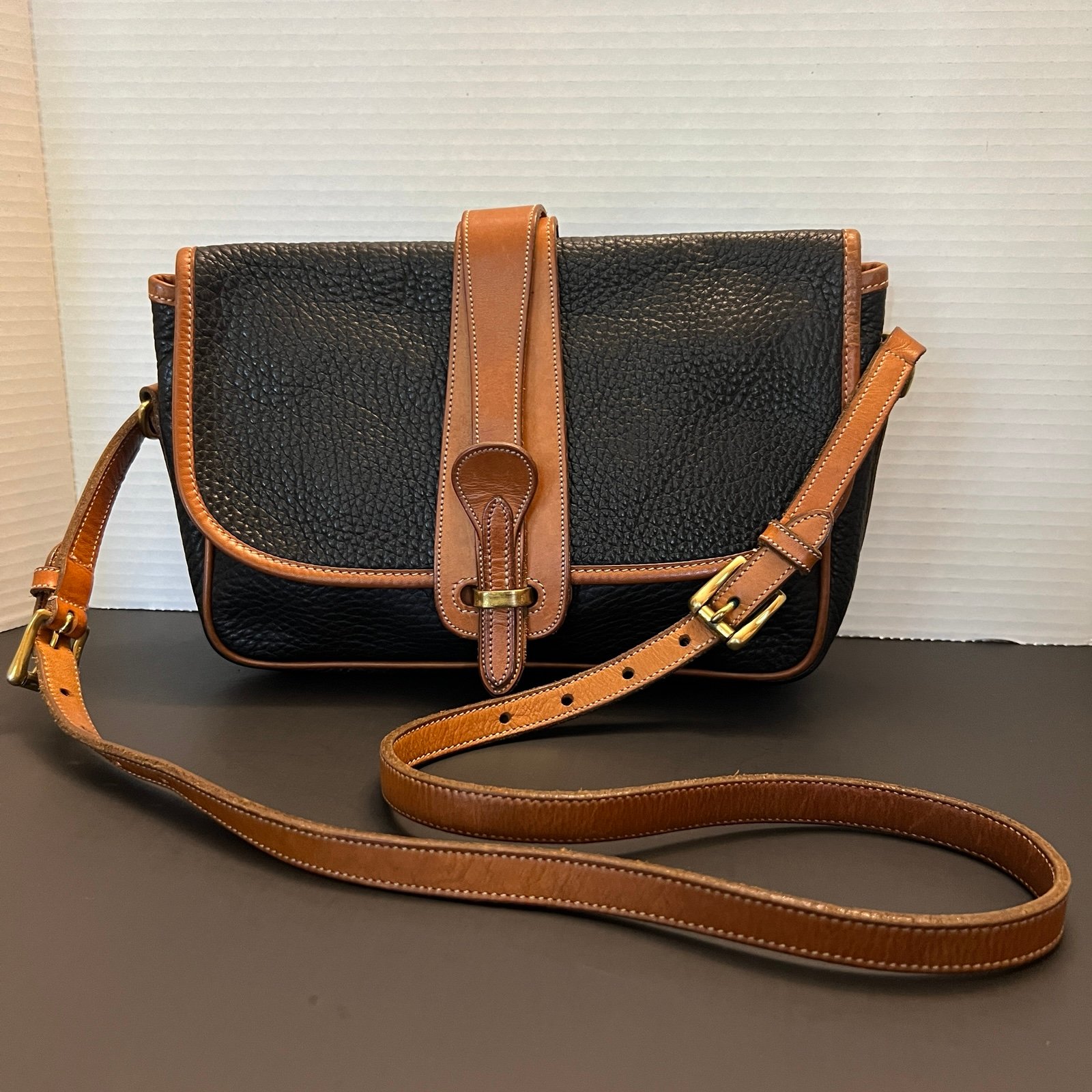 Capture timeless American style. Crafted from durable pebble leather in a classic two-tone design, this bag is a testament to the brand's enduring quality and craftsmanship. The adjustable strap allows for comfortable crossbody or shoulder wear. The flab is fold over style with a leather clasp. Solid brass hardware. Adjustable shoulder strap which is removable if desired