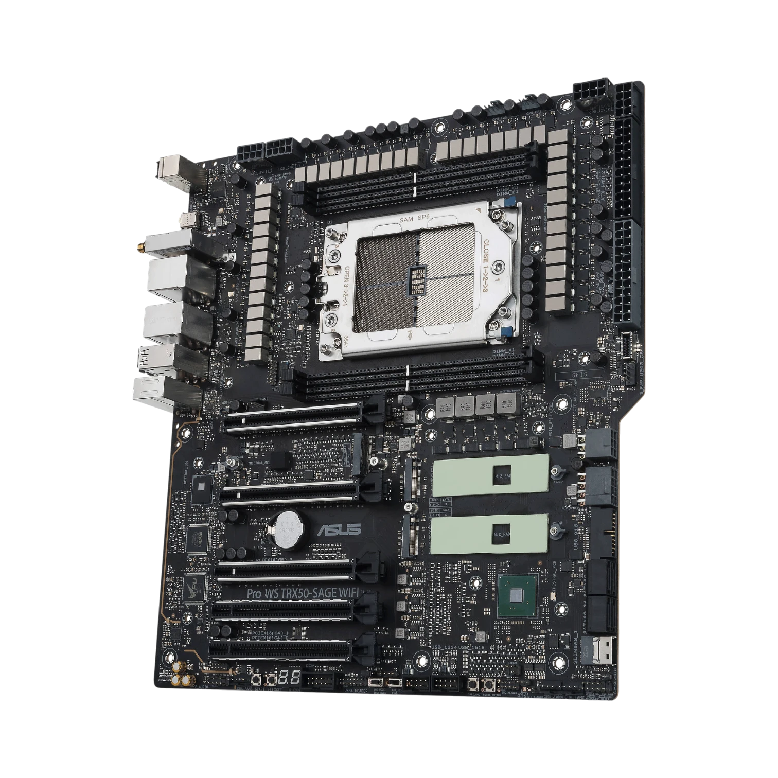 The ASUS PRO WS TRX50-SAGE WIFI is a workstation-grade motherboard for professionals who rely on AMD Ryzen Threadripper power to keep large projects moving. It pairs the sTR5 socket with support for both Ryzen Threadripper PRO 7000 WX-Series and standard Threadripper processors, so you can choose a CPU that fits your workflow, whether you edit 8K video, render complex 3D scenes, or run detailed simulations.