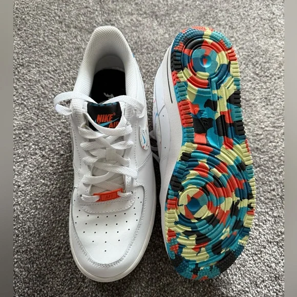 These Nike sneakers boast a clean white base with a striking multicolor splatter pattern, offering a unique and artistic flair. The low-top design and white laces enhance their sporty appeal, while the white sole ensures a sleek finish. Perfect for those who appreciate a blend of style and comfort in their footwear.