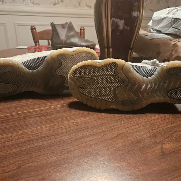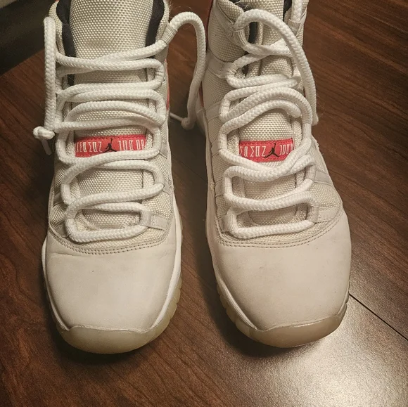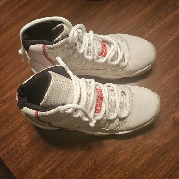 Good used condition Air Jordan 11 Retro Platinum Tint Men's/boy's size 7. They are no longer as white as the original color shown in 1st picture but still in great shape. Original retail of $300. Current Stock X price of $387 Come from a Non-smoking home The Air Jordan 11 Retro ‘Platinum Tint’ does away with the one detail most commonly associated with the classic silhouette—its shiny patent leather overlay. Instead, the mid-top takes on a nubuck and ballistic mesh build, finished entirely in understated Platinum Tint. Contrasting color arrives via University Red detailing on the tongue and Jumpman on the lateral heel.