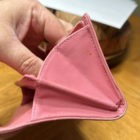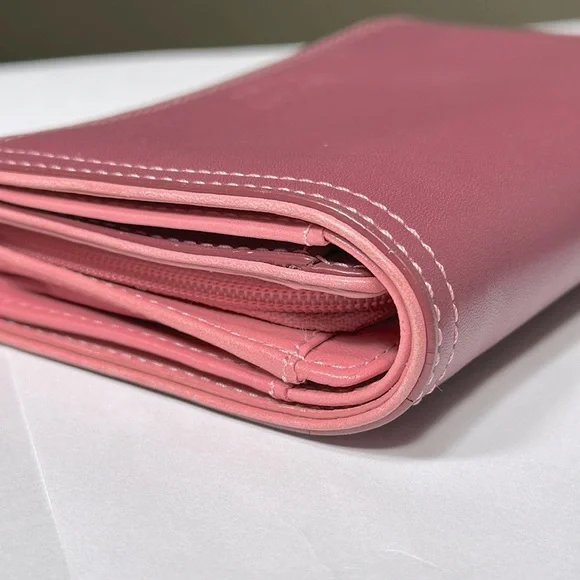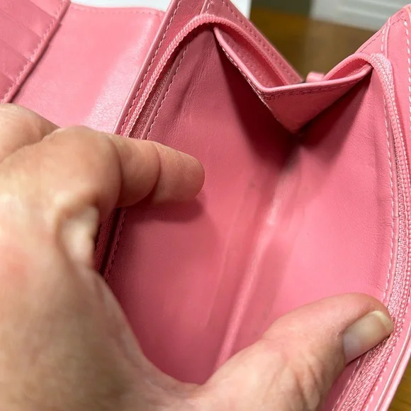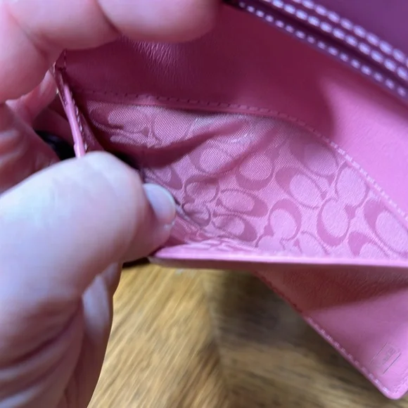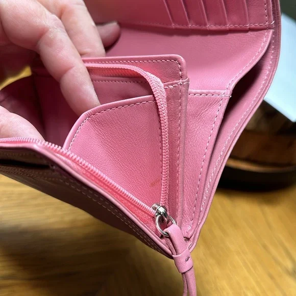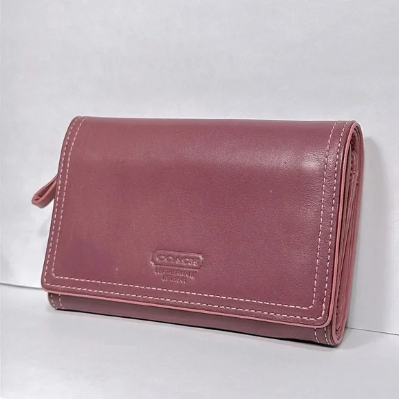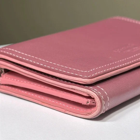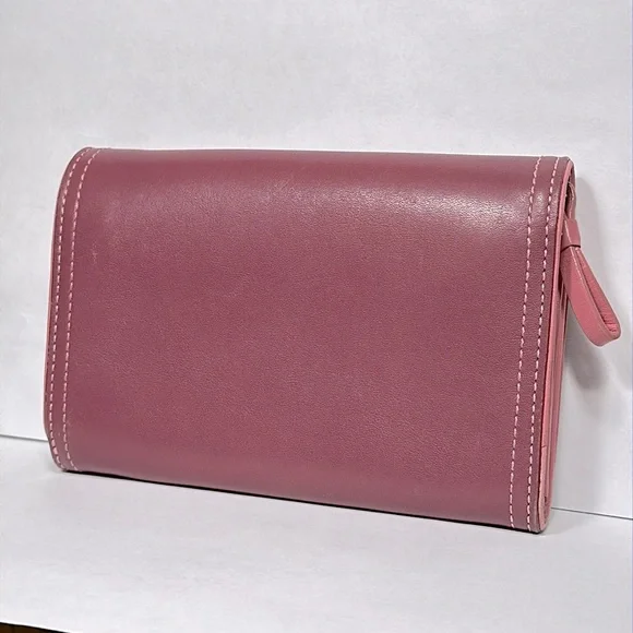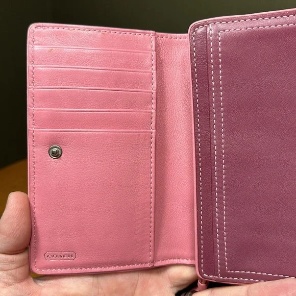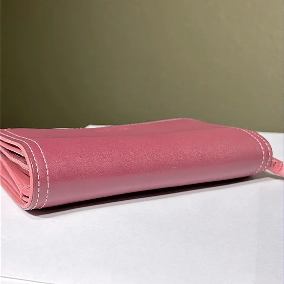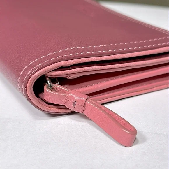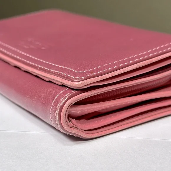 This rare and beautiful Coach bifold. Rose pink smooth leather exterior with pink leather trim and pink leather interior. Front snap flap opens to 5 card slots, small slip pocket, large open pocket, zippered coin pocket, and bill pocket. All pockets are lined with pink Signature pattern sateen material. All linings are clean and free from any flaws. Coin pocket shows some use. The interior and exterior leather are in amazing condition with only a few light marks. See all photos for visual details. Size 5 5/8” x 3 3/4” x 1”.