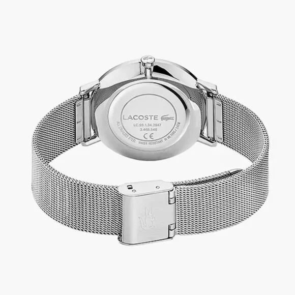 BRAND NEW WITH BOX AND TAGS LACOSTE 2001078 MOON SILVER DIAL SILVER MESH STAINLESS BRACELET WOMENS WATCHWith an ultra-slim case, the Mesh band version Lacoste Moon for her celebrates femininity. This is the perfect complement to a galaxy of outfits.Water resistance: 3 ATM / 30 metersMovement: 2 handsCase diameter: 35 mmMaterial: Stainless Steel Mesh Band