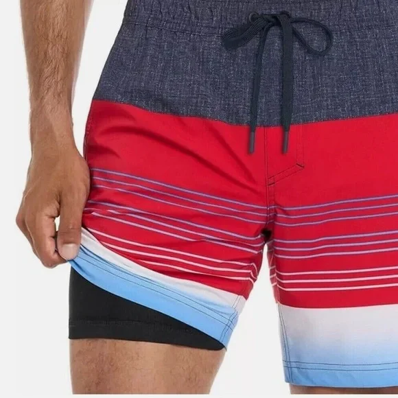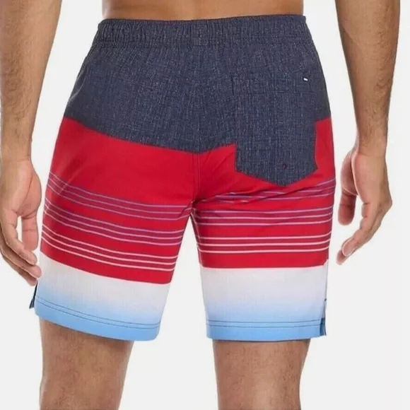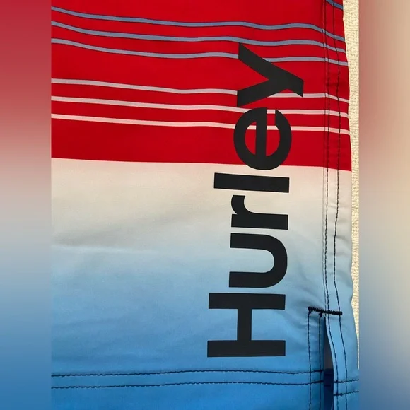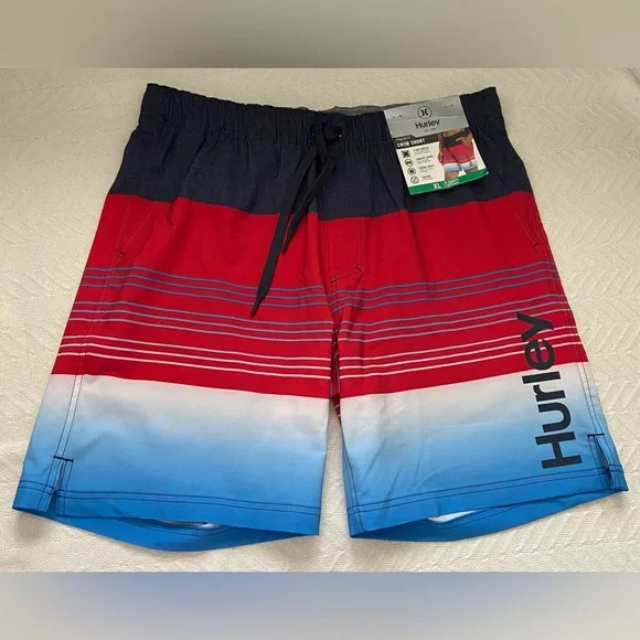 Experience the ultimate comfort and style with these Hurley Swim Shorts in size XL. Featuring a classic blue color with striped pattern, these shorts are perfect for any outdoor occasion. The drawstring waist ensures a secure fit while the lined and stretchy material provides maximum comfort. These shorts are machine washable and made with a durable blend of polyester and spandex, making them perfect for recreational activities. With multiple pockets, you can conveniently carry all your essentialsStylish red and blue board shorts by Hurley. Ideal for beach or pool days.Size XLNew with the tags!!!