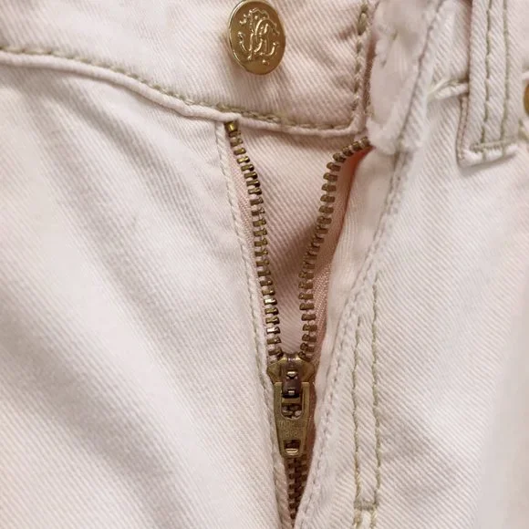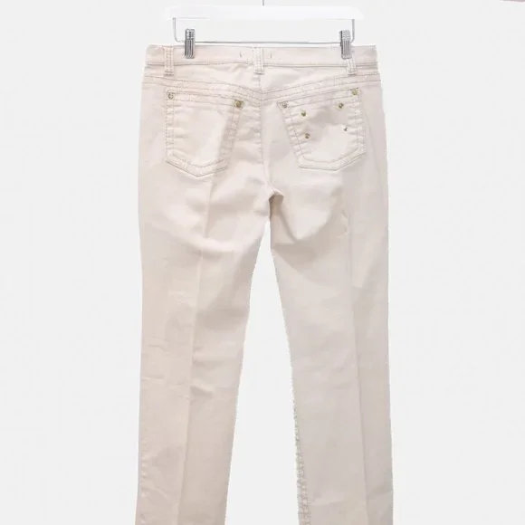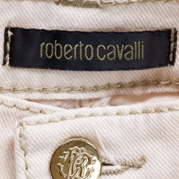 Roberto Cavalli denim jeans in nude pink featuring a straight leg, 5-pocket styling, a classic fly closure with a branded gold-tone button, decorative top stitching, belt loops, and four gold studs on the right back pocket.Size: IT 44Condition:Excellent; no visible signs of wear, leather application that buttons to the back pocket studs is missingApproximate Measurements (Laid flat):Waist: 15” (38 cm)Hip: 19” (48 cm)Length (inseam): 29.5” (75 cm)Rise: 8” (20 cm)Composition: 98% cotton, 2% elastane