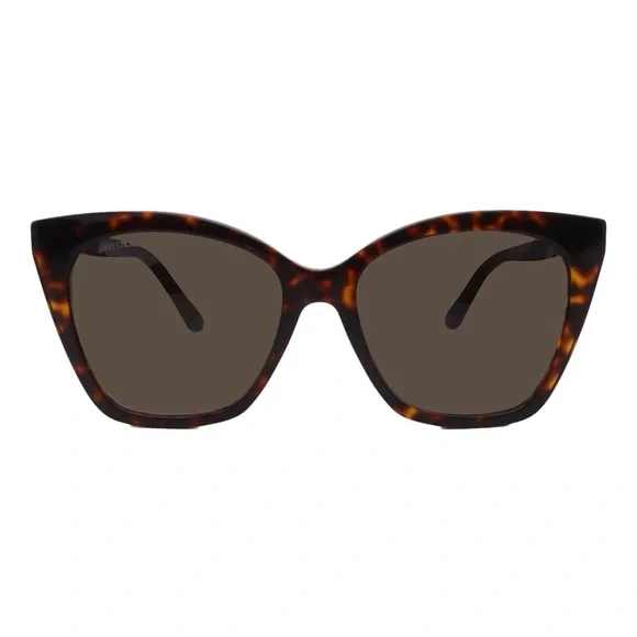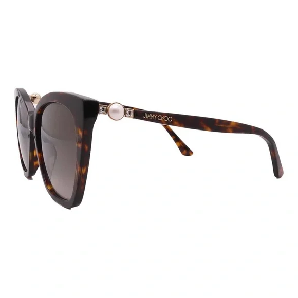 The Jimmy Choo Rua Sunglasses feature a butterfly lens shape with a Cat-Eye profile suitable for women. The acetate frame is accented with pearl and crystal details at the hinge on both sides. This model features a wide saddle bridge to provide an Alternative Fit; ideal for those with a less prominent nose bridge. Jimmy Choo garnered fame for his line of handmade women's shoes and prestigious fashion accessories. Providing 100% UV protection from the sun's harmful rays these sunglasses are functional in addition to being fashionable.Frame Material: Plastic (Acetate)Frame Color: HavanaLens Color: Brown GradientSize: 56-18-145Made in ItalyPurchased from Sak’s along with another color and ended up keeping the other pair. Includes Jimmy Choo case and Jimmy Choo brand lens cloth that came with the glasses. Lens cloth is unopened.