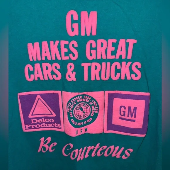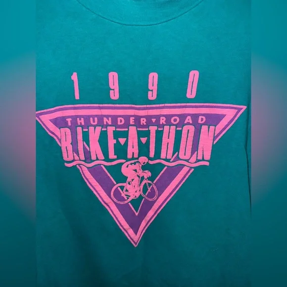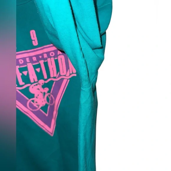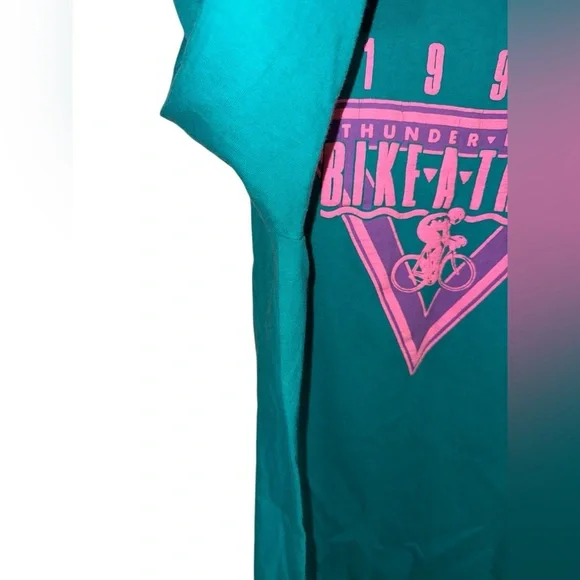 This stylish long sleeve shirt features a vibrant teal color with a bold pink and purple graphic. Perfect for casual wear, it combines comfort and style effortlessly.Vintage/1990Double front/back “puffy” graphicNeonFront: Thunder Road Bike-A-Thon 1990Back: GM makes great cars and trucks Be Courteous Some cracking on the graphicPlease check measurements as vintage sizing can vary greatly from modern sizing Hanes Beefy long sleeve tshirt sz Large unisexFlat lay measurements approximatePit to pit: 20.5”Length: 27”1990, 90s, vintage, vtg, beefy, Hanes beefy, long sleeve shirt, crewneck, tshirt, tee shirt, GM, Collection, collector, collectible, neon, puffy, double graphic, unisexBG6