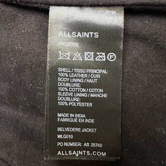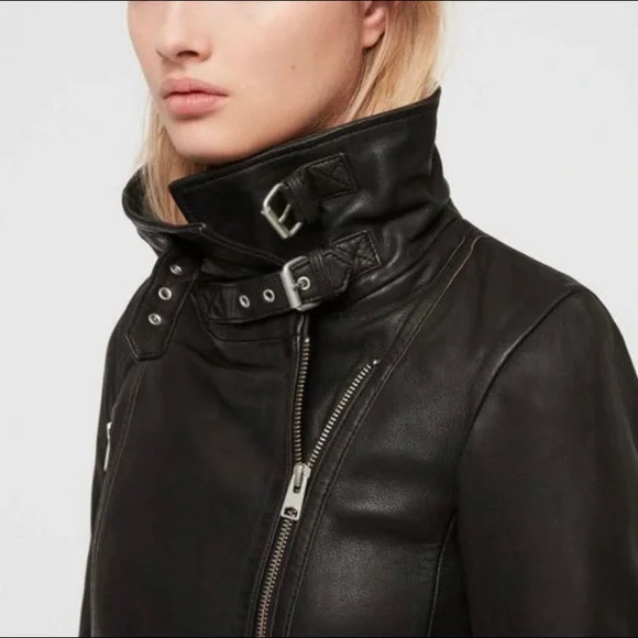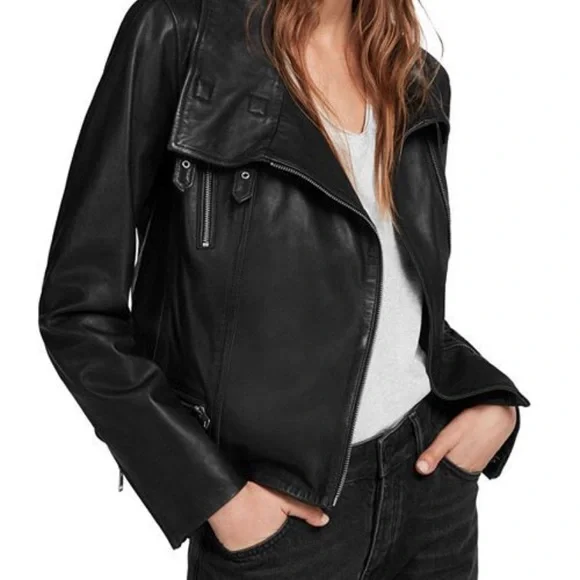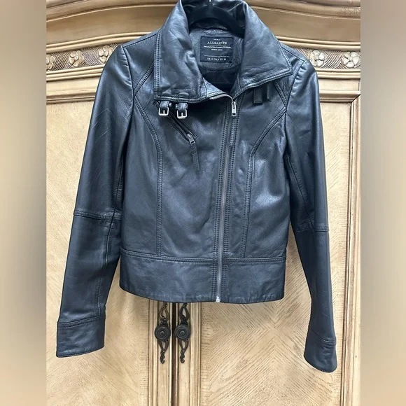 excellent conditionAll Saints Moto JacketblackSize 6approximate measurements laying flatchest 17”waist 16”🦋check out my other listings (free people, james perse, splendid, frame, Loius Vuitton, all saints, rag & bone, child of wild, spell, dvf, zadig & voltaire, wolford, chasing unicorns, CD, MAC, Anastasia, too faced, benefit, clarins)🦋