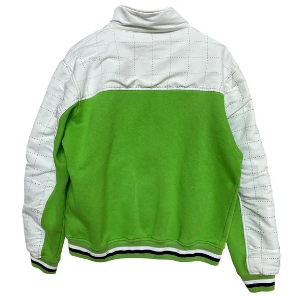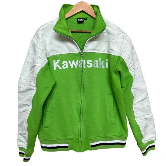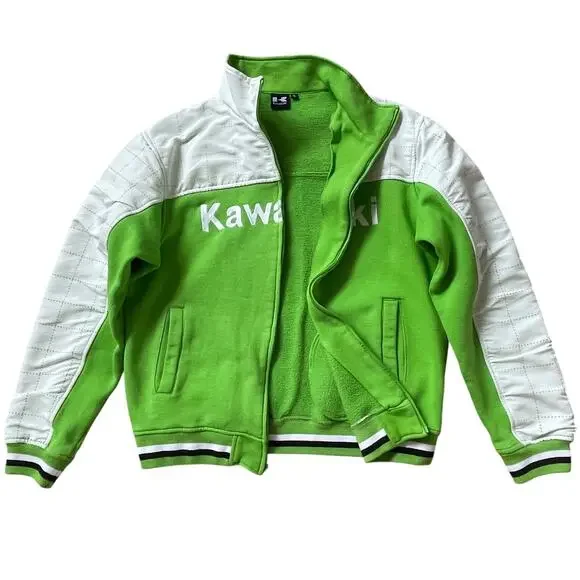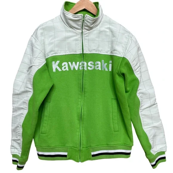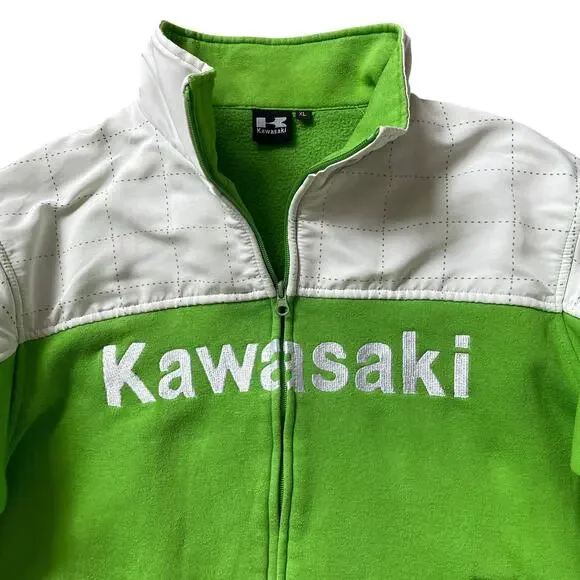 *Please see measurements as moto jackets sometimes are more fitted.Turn heads in this bold Kawasaki racing-style jacket, featuring quilted white moto sleeves and vibrant Kawasaki green fleece body. Full-zip front with retro varsity ribbed trim at cuffs and hem. Classic Y2K motocross vibes with a sporty edge — a perfect piece for riders, fans, or vintage streetwear collectors.Brand: KawasakiSize: XL (see measurements)Color: Kawasaki green with white accentsMaterial: 65% Cotton / 35% PolyesterClosure: Full zipFeatures: Embroidered logo, quilted sleeve paneling, varsity stripesFit: Relaxed/unisexGood pre-owned condition with some wear. One tiny pin-size discoloration near the zipper (see close-up pic).Flat Measurements (approx.):Chest (pit to pit): 23.5"Length (shoulder to hem): 25.5"A RARE find - great for fans of Y2K style, motorsports fashion, or statement streetwear.Fast shipping | Very clean, smoke-free, pet-free home.Nash Nest ~ New Life for Vintage Vibes.