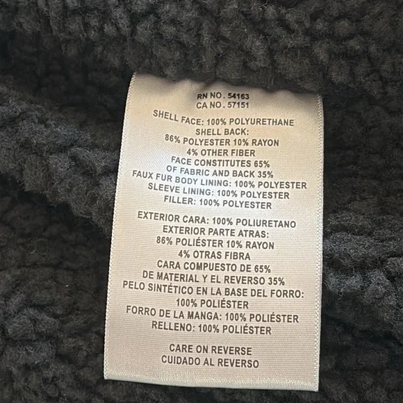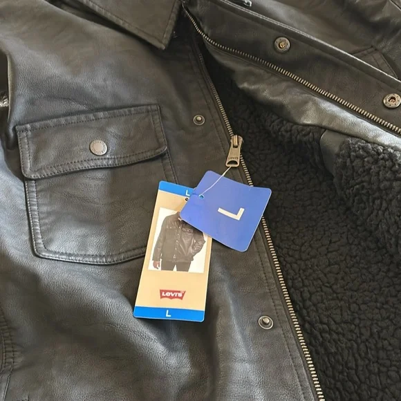 Update, your cool weather wardrobe with this Levi’s faux leather/Sherpa lined trucker jacket. Features: long sleeves, classic lay-down collar, button and zipper closure, water and wind, resistant, midweight, faux sherpa fur, two front chest patch pockets, two side pockets, and one interior pocket; made with polyurethane with polyester fill and lining. NWT.