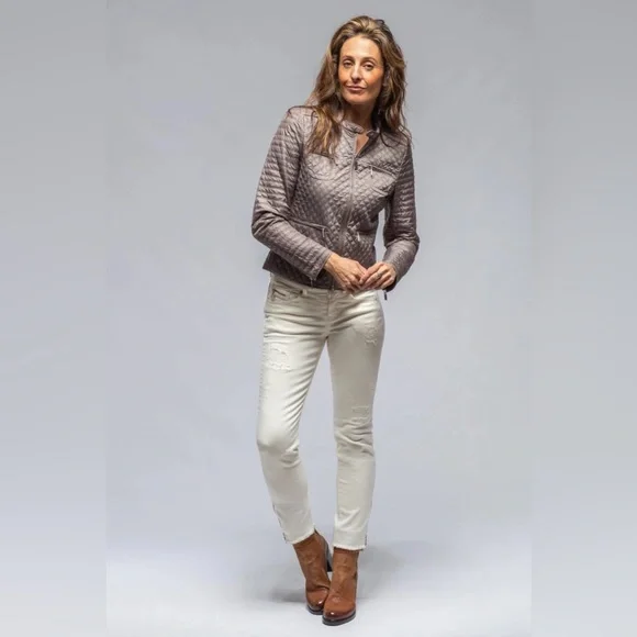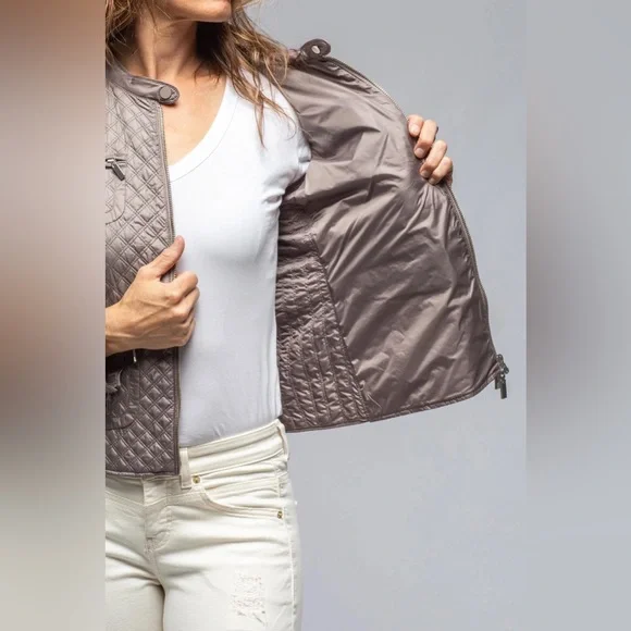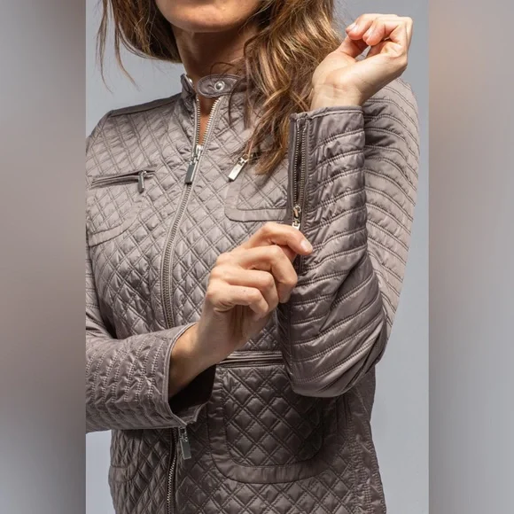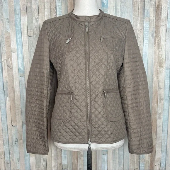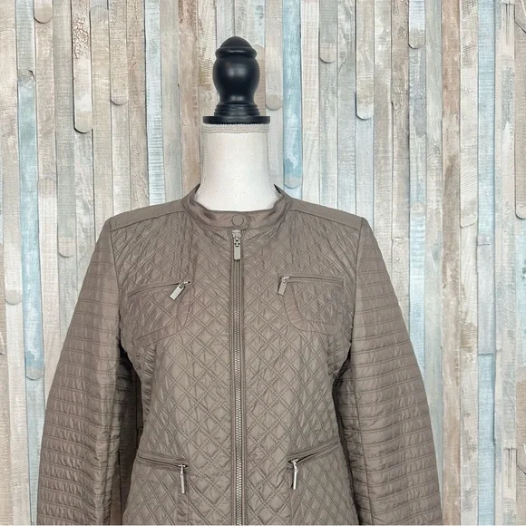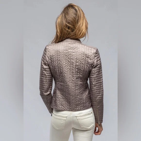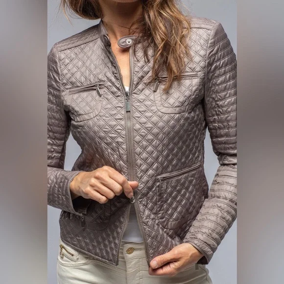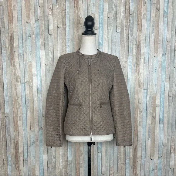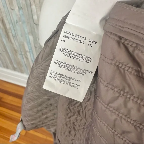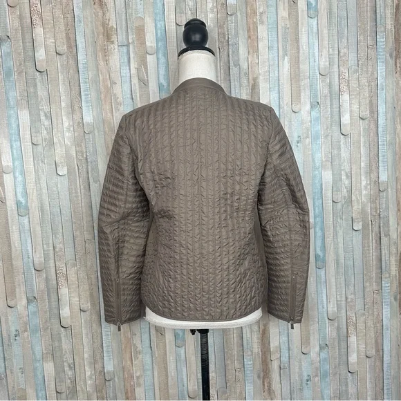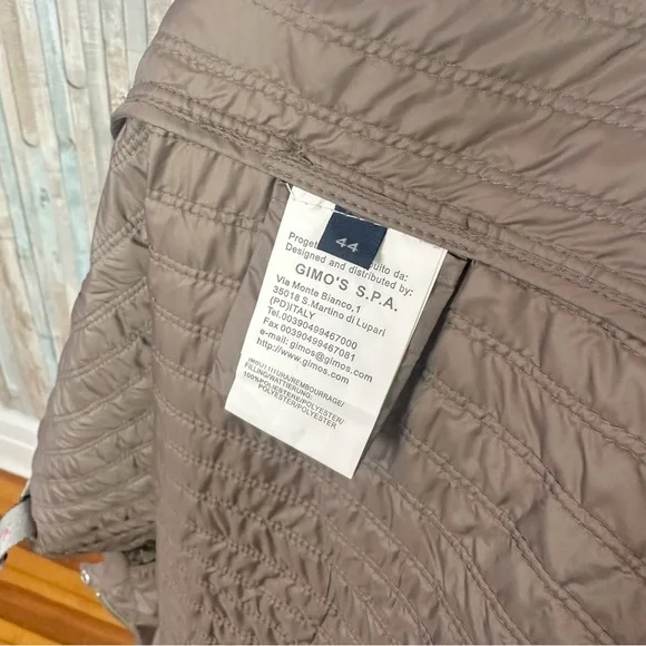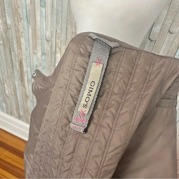 The Eliza Micro Puff by Gimo's is a lightweight quilted moto jacket.Diamond stitch pattern on front, horizontal stitch on arms, vertical stitch on back. 2 way zip front. 4 zipper pockets with clean metal pulls. Zipper details on cuff. Banded collar with snap. Flattering, shapely tailored cut. 100% polyester. Putty taupe color with sheen. Retail: $715.Size 44 / US 8Bust: 18.75” across underarmsWaist: 18” acrossLength: 22.25”Great gently preowned condition