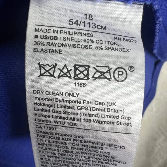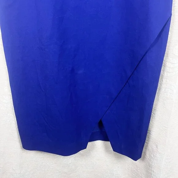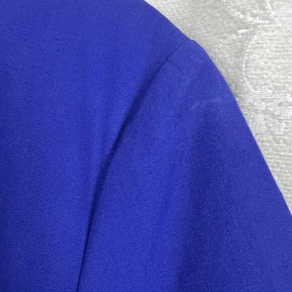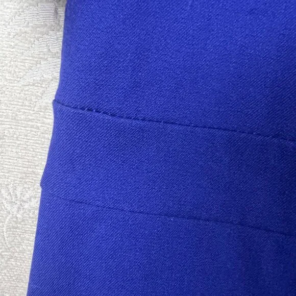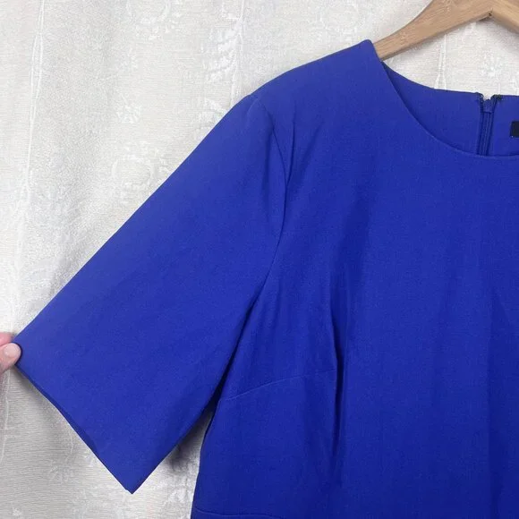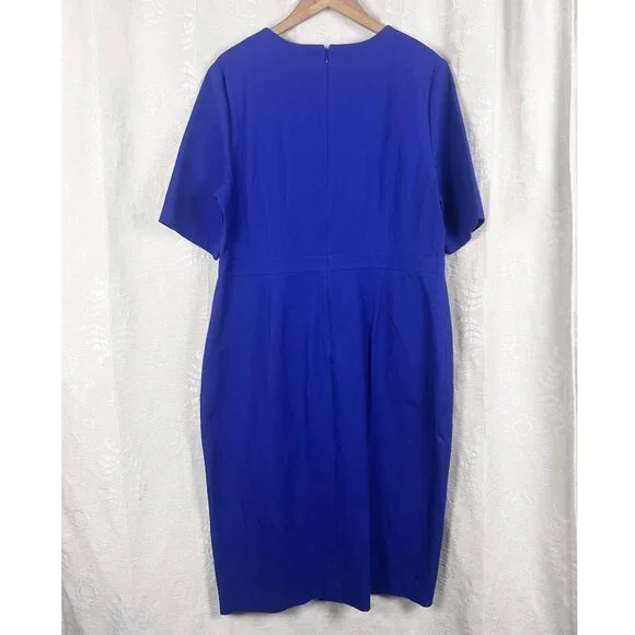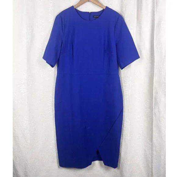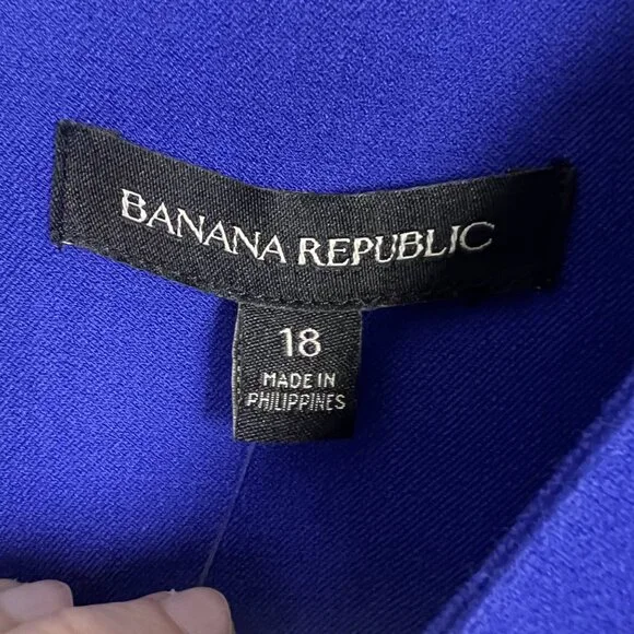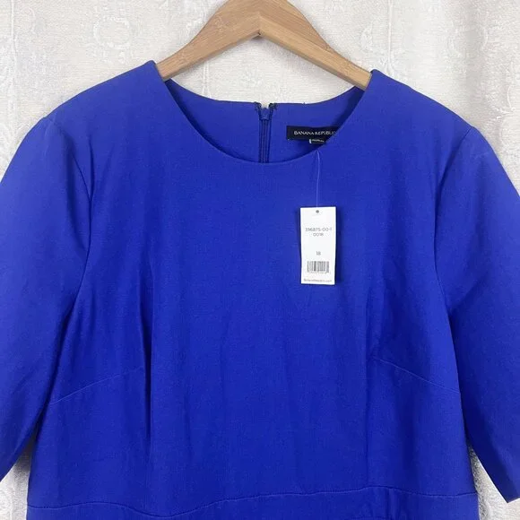 NWT Banana Republic Royal Blue Bi-Stretch Dress, size 18.Short sleeve stretch cotton blend dress in royal blueRound neckDefined band at waistSide slitBack zip closureUnlinedCotton/rayon/spandex, dry cleanSuiting, business, formal, party, cocktail, preppy, academia, ivy leagueNew with tags. Condition: There are white marks on the left shoulder and the front of the skirt that most likely will come out when laundered. Seam around waist is slightly pulled, still intact. See photos. See last photo for approximate measurements. All measurements are taken with garment laid flat.