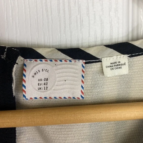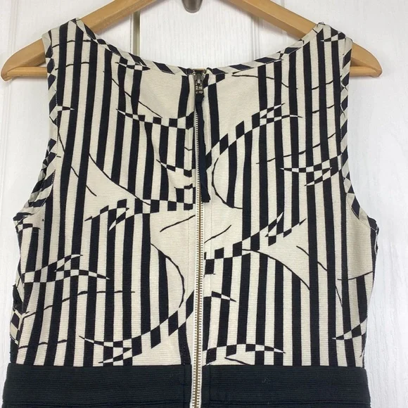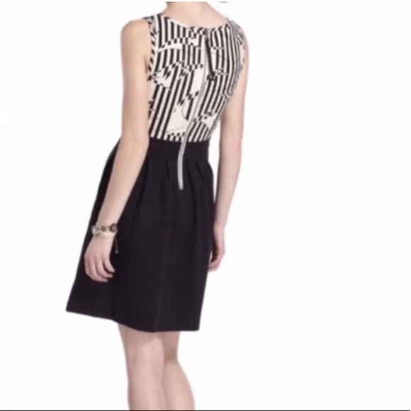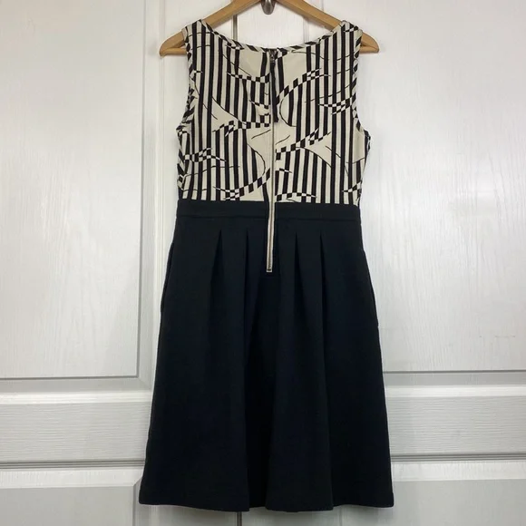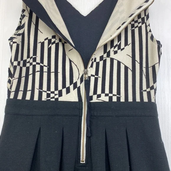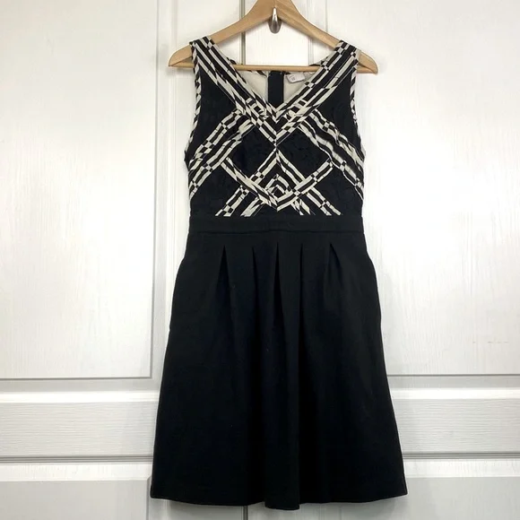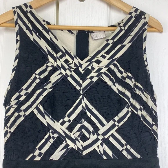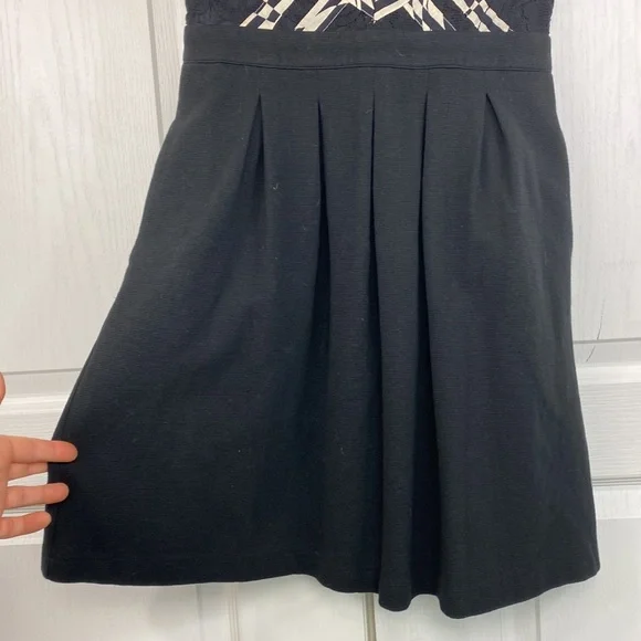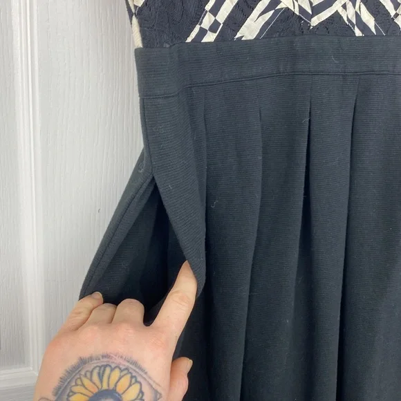 Postmark from Anthropologie “Voksoper” fit and flare dressFun black & cream geometric pattern on top, fabric and lace patchwork Solid ribbed black skirtNice thick fabric2 side pockets Back Zipper closureMeasurements:Length 35.5”Waist 14”Pit to pit 16.5”Hip 24”Arm opening 8.5”In excellent like new condition