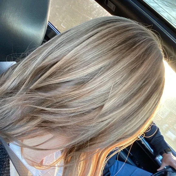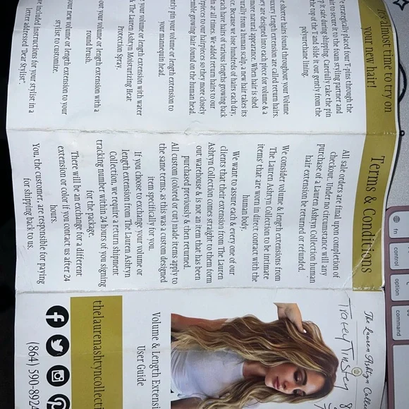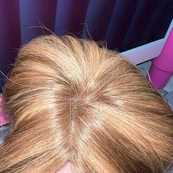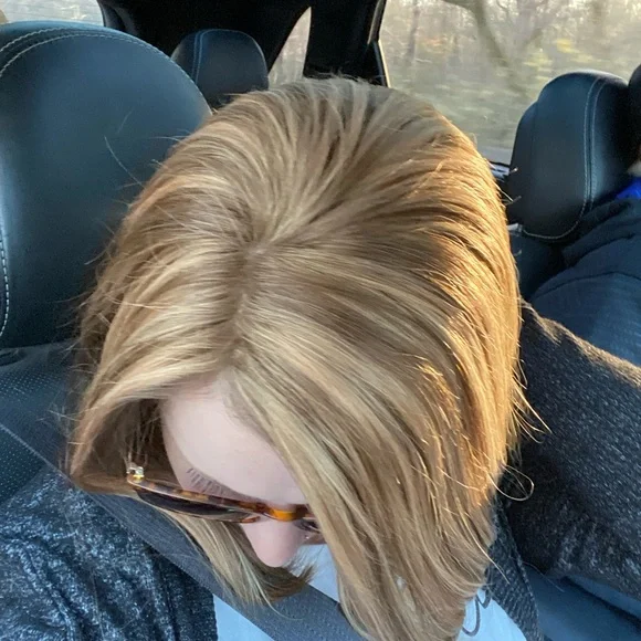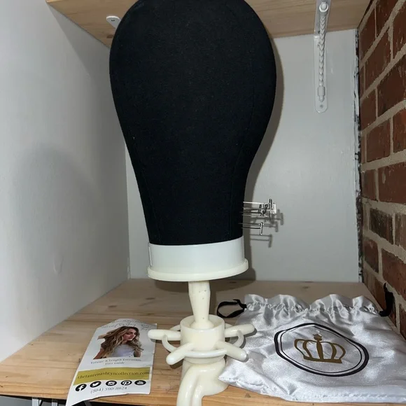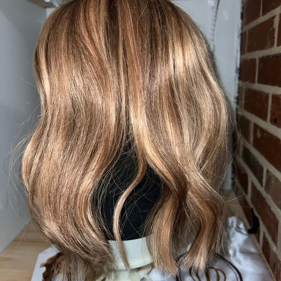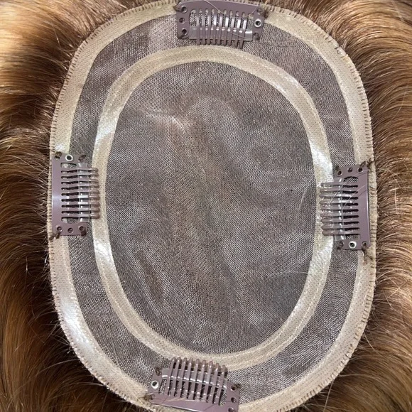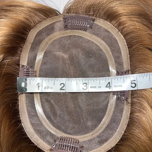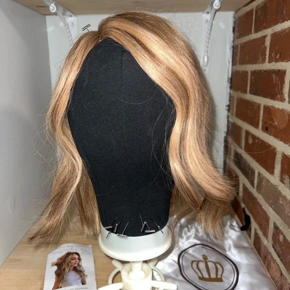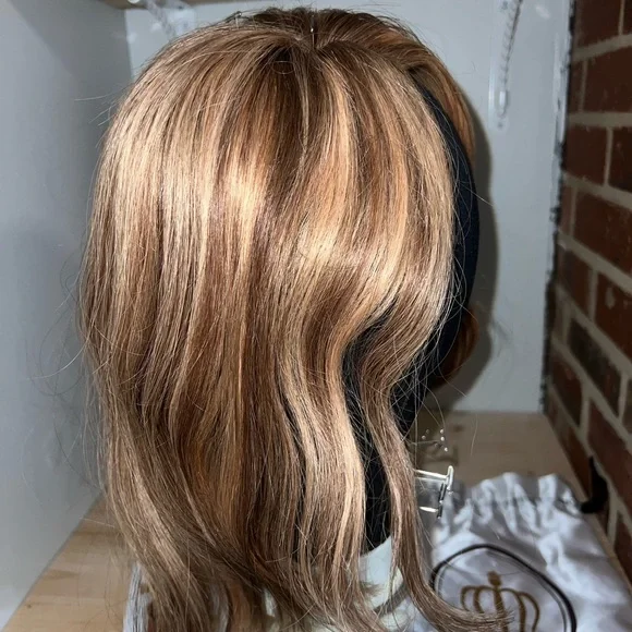 The Lauren Ashtyn Collection full volume human hair topper Has been worn ONCE (see photo) Measurements included in photos. Never washed or styled. Purchased directly from the in-person store. Cut and styled by them. It is parted slightly to the right, but the part can be changed. Includes silk bag, mannequin head with pins and swivel clamp stand.