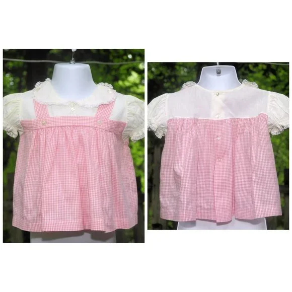 VTG 60's Baby Girls Pink Micro Gingham Check Dress w/ Gold Sparkle Threads 9-12MDarling for a Party, Church or Photo Shoot!Faux Suspender LookPink Micro Gingham Check Cotton w/ Gold Sparkle ThreadsIvory 'Blouse' w/ Peter Pan Collar with LaceShort Puff Sleeves w/ Lace TrimUnlined4 Button BackNo Brand LabelVery Good ConditionThe dress is a size 9-12 month size, please see the measurements for the best fit for your girlChest: 23" Length: 11 1/2"