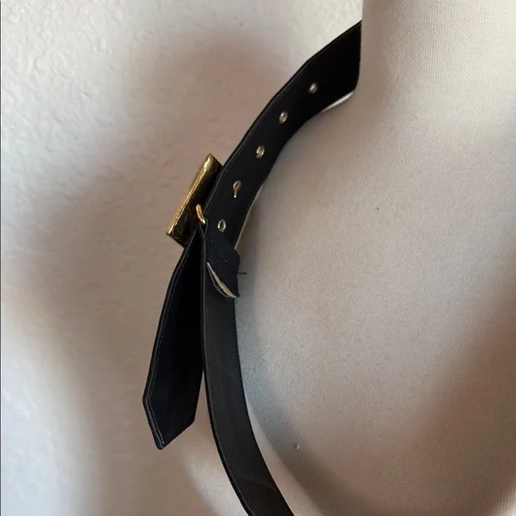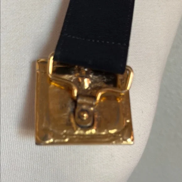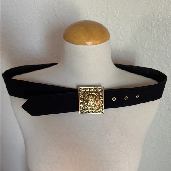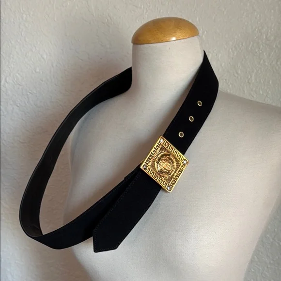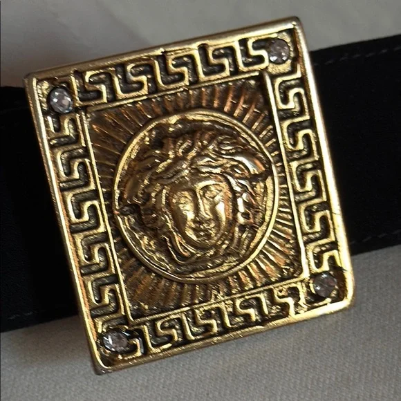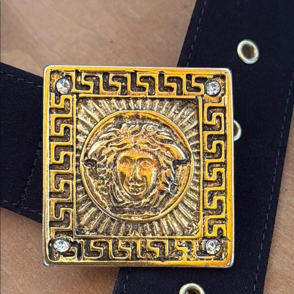 This Vintage belt has a Versace design buckle with rhinestones in EUC, brand not stamped. Elegant black belt featuring a striking gold Medusa buckle. Perfect for adding a touch of luxury to any outfit.🖤 Chunky gold tone Buckle 🖤 faux Leather and fabric belt Please see all photos for details and condition Approx measurements 37” x 1.5” Buckle 2” x 2”
