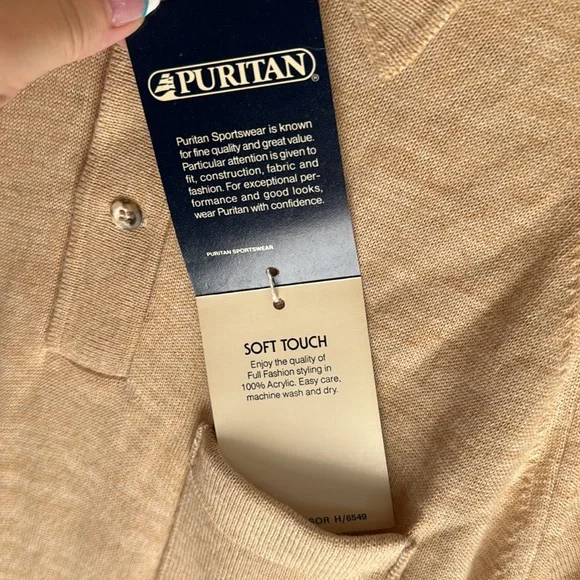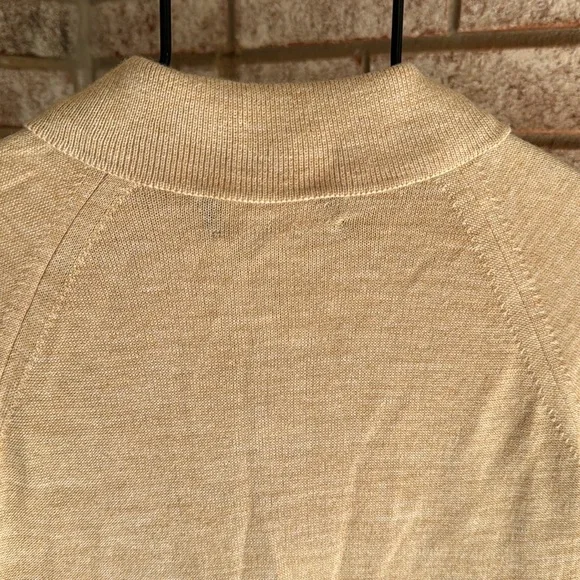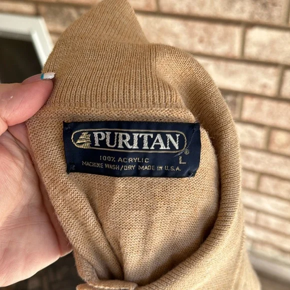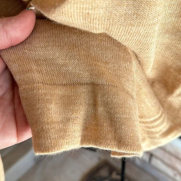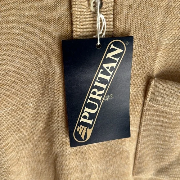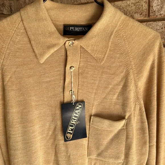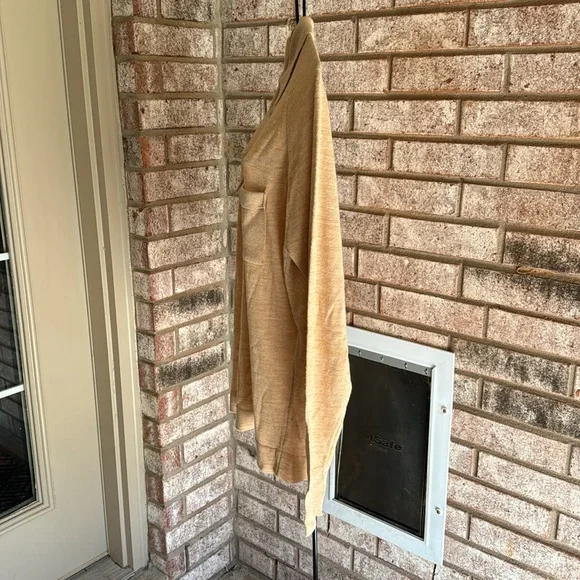 New with tags old stock. Part of a huge vintage collection of clothing and lingerie. No smoke or pets. Thin acrylic. tag is loose on one corner inside neckline, as shownThis is a Heatheredtan with a lighter color blended in Vintage size largeUnder arms 45Waist 40Hips: 40Front shoulder to hem line 29.5Shoulders across not inset Collarto end of sleeve :33.8