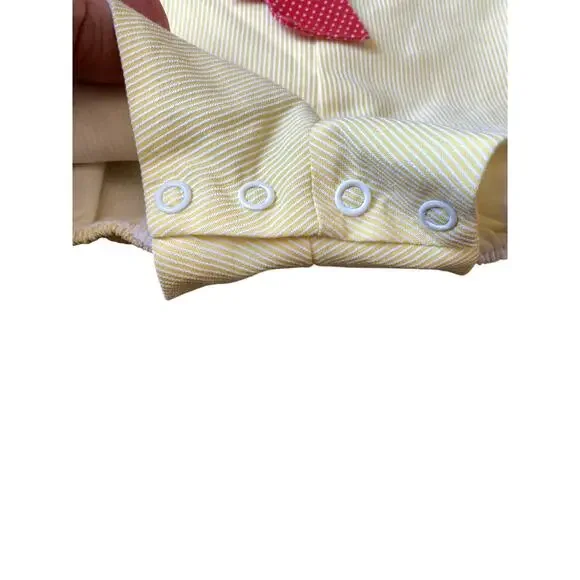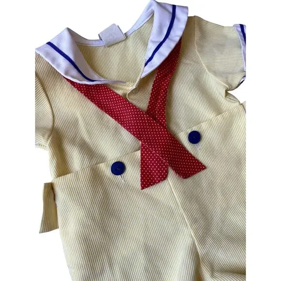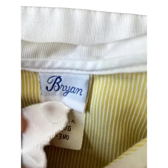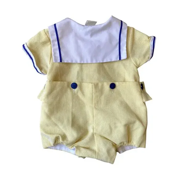 Vintage Bryan Baby Sailor Suit One PieceSz 0-3 moYellow w/ white stripesBlue button detailsCollaredSnap closure at crotch75% Polyester25% CottonThis would be super cute for newborn photos!Good preloved conditionClean, smoke free homeAll sales are final!Please review photos of exact item being purchased.Check out our other listings!