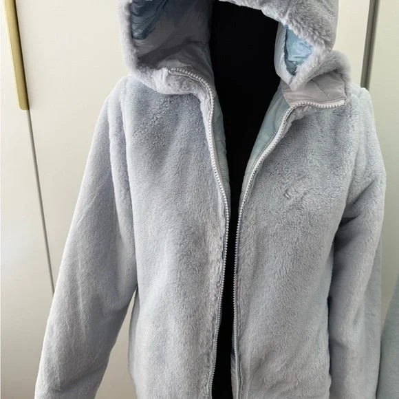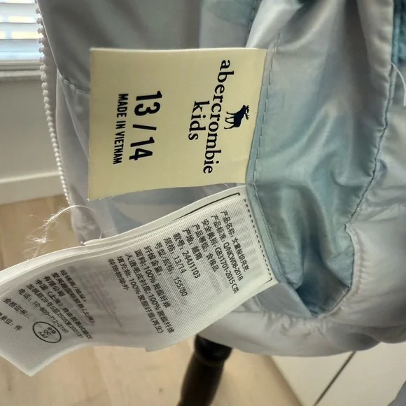 Keep your teen cozy and trendy all winter long with this amazing Abercrombie & Fitch puffer! This jacket is in excellent condition and offers ultimate versatility with its reversible design.⚡️Side 1: Classic puffer look with a cozy faux fur lining.⚡️Side 2: Stylish plain sky blue fleece for a different vibe.Designed for comfort and warmth, it's wind-resistant, water-resistant, features cozy lined pockets, and is super easy to care for as it's machine washable. Fits age 13/14 years.