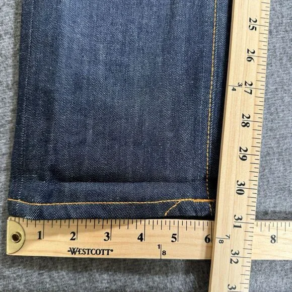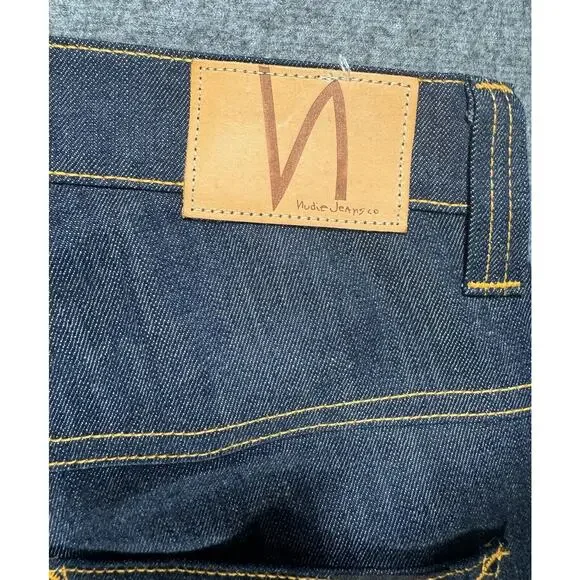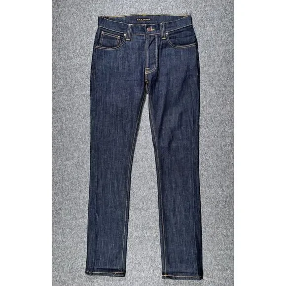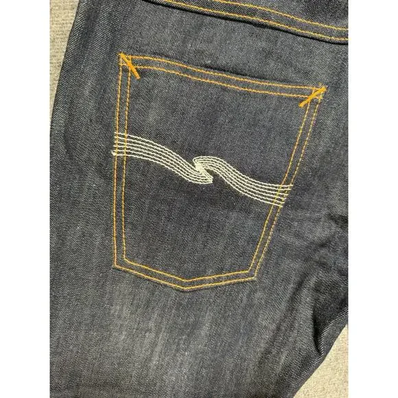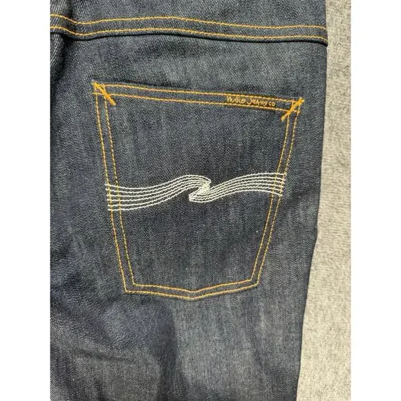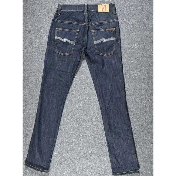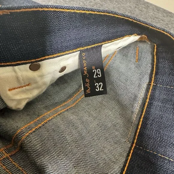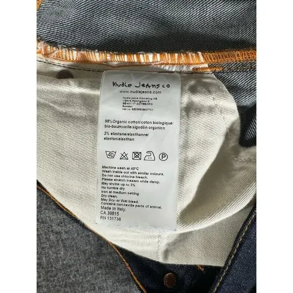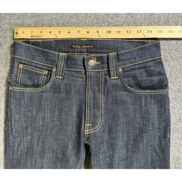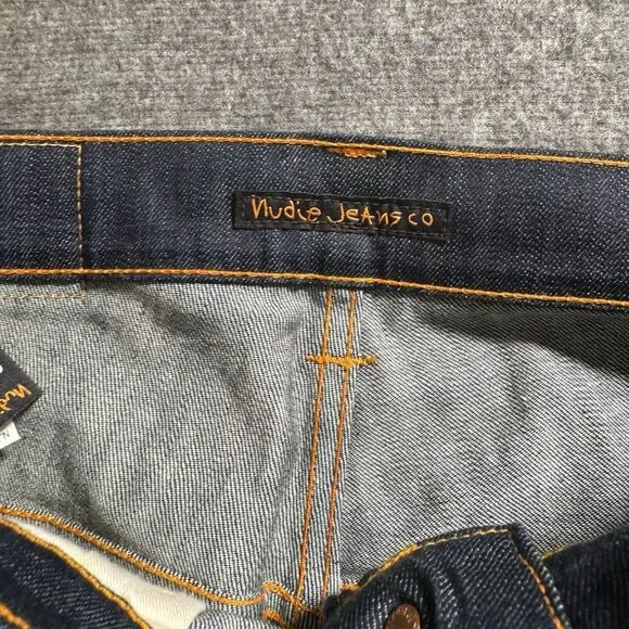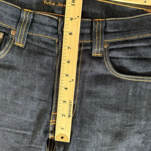 Upgrade your wardrobe with these Nudies THIN FINN jeans. Made from organic cotton, these jeans are perfect for those who love sustainable fashion. With a waist size of 29 inches and inseam of 32 inches, they are designed to fit slim and have a mid-rise. Featuring a solid blue color, zip and button closure, and accents like a zipper and logo, these jeans are both stylish and functional. The stretch fabric makes them comfortable to wear, and they are machine washable for easy care. Whether you're going for a classic or modern look, these jeans are a great addition to any outfit.Excellent condition. No holes, no stains. Measurements listed below for perfect fit. All items arewashed per eBay's policy and standards. 30 day returns. If you have any questions or concerns, please message me and I will respond promptly.Waist - 30 inchesInseam - 31 inchesRise - 9 inchesLeg opening - 6 inches