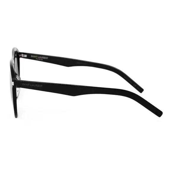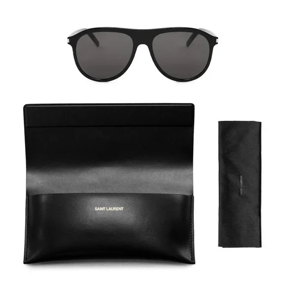 * Add a pop of elegance to your ensemble this season with these SL432 pilot sunglasses. * Crafted entirely from a black acetate frame, these full rimmed frames have a thick border, and a bold bridge. * The flat arms are made from the same black acetate and have the Saint Laurent name engraved on each temple.