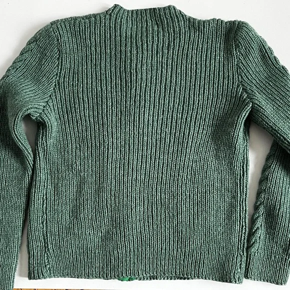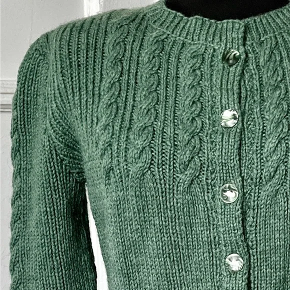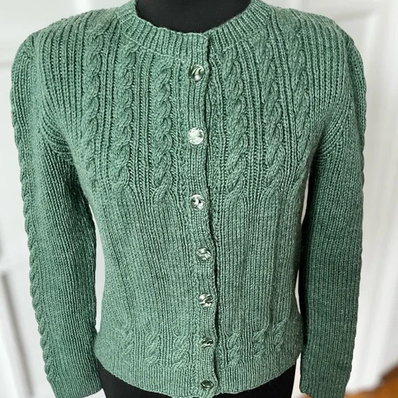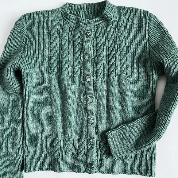 The most darling, warm wool cardigan, expertly hand knit (thus no tags) circa 1930s - 50s. Excellent condition!+ Gorgeous green, soft yarn (photos show color in different lighting)+ Thick and warm!+ Cable knit design on chest, waist and down the sleeve. + Crew neck+ Seven matching buttons down the front: round green with glossy marbelized finish (reinforced on the interior with green grosgrain ribbon). + Designed to hit at waistSIZE: No size tag, but fits sizes Small and Medium as knit allows stretch. Check actual measurements below to confirm fit. Width (laid flat, measured across):Chest: 18” pit to pit, unstreched (comfortably stretches up to 2 inches)Shoulders: 15” seam to seam, unstretchedWaist: 16” at hem, unstretched (comfortably stretches up to 2 inches)Length:20 1/8” shoulder to hem20 3/4” back of collar down Sleeves:16” inseam (from underarm)21” from shoulder seamNOTE: Unstretched measurements are more like a small, but I’m a true medium and it fits me well … would just look better on someone less long / thick waisted than me. CONDITION: Excellent with only general signs of age and/or wear such as the most minor pilling / fluff here and there.
