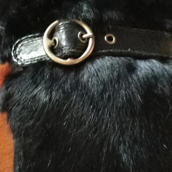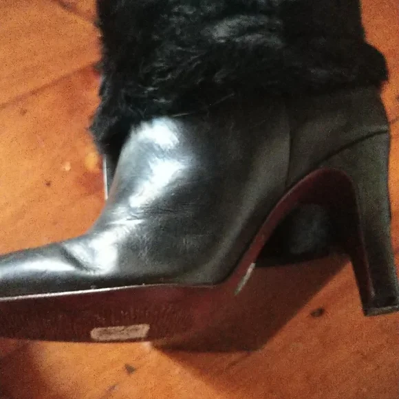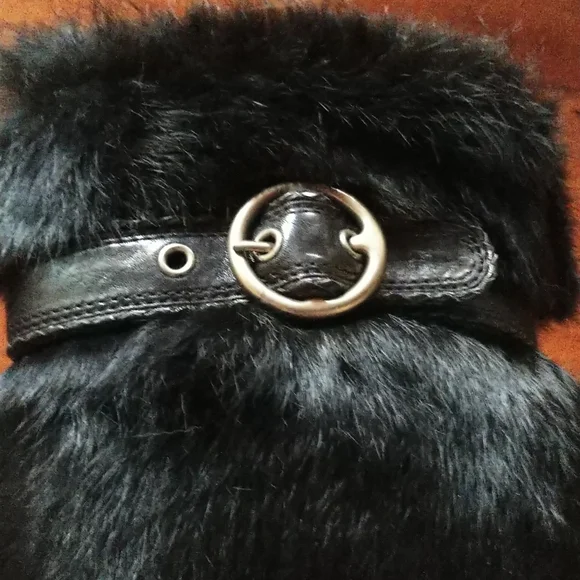 Premier American Boot maker FRYE's gorgeous Ava Black Faux Fur Boots are Calf leather heel-toe withbrass-buckled leather-belted Fur body of boot.Rounded tapered toe. Brass logo on soles has oxidized while in storage. Smooth leather lining Cushioned leather soles - leather soles always scarify readily.Self covered leather heel with rubber liftEUC as only worn once on a frigid, snowy Christmas Eve (moved to FL afterwards so no opportunity) & because they were I can tell you they're WARM! Size 8Heel is a smidge under 4" tallEntire Boot 18" tall