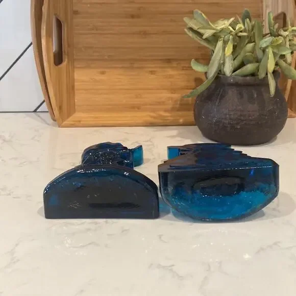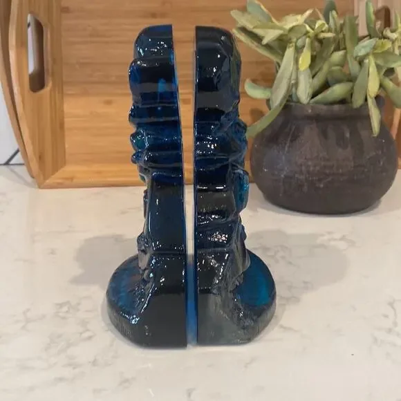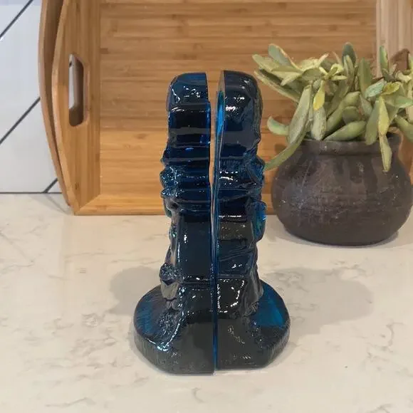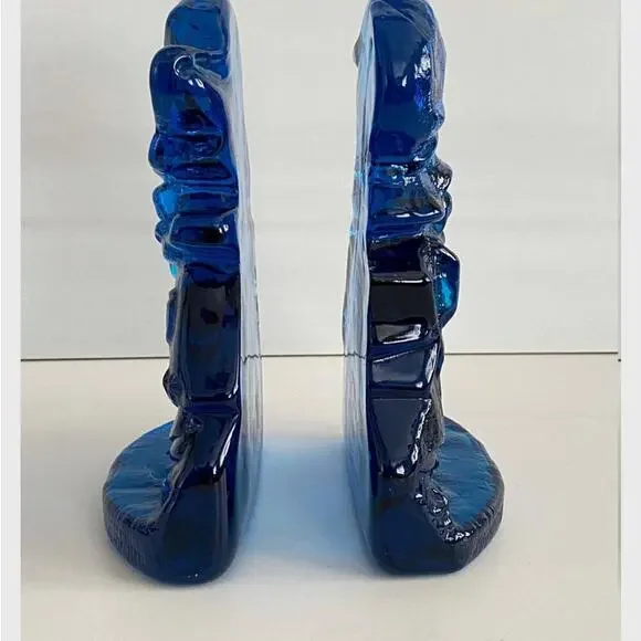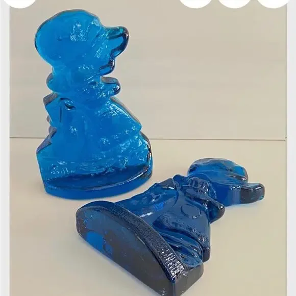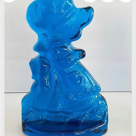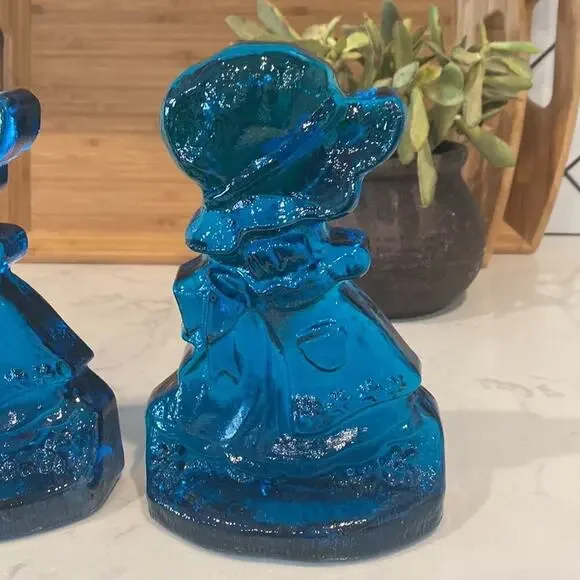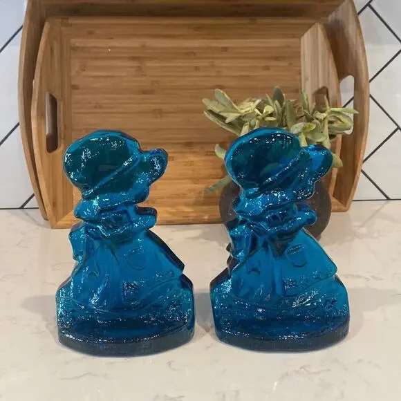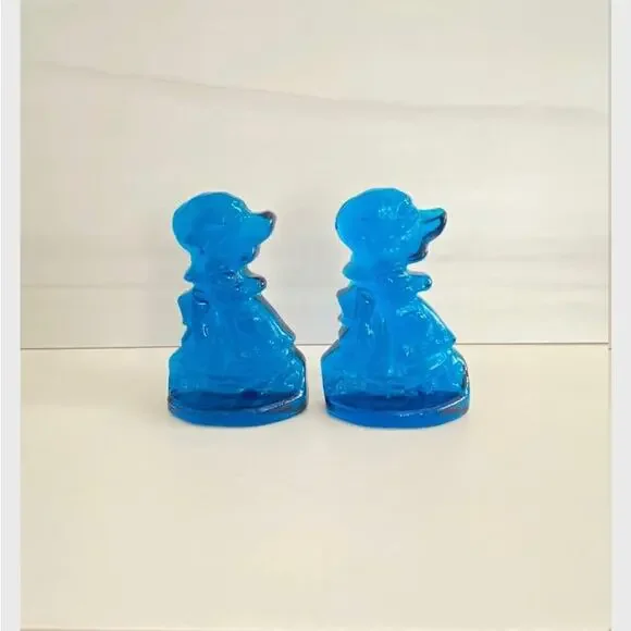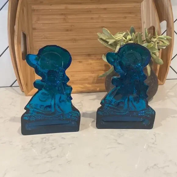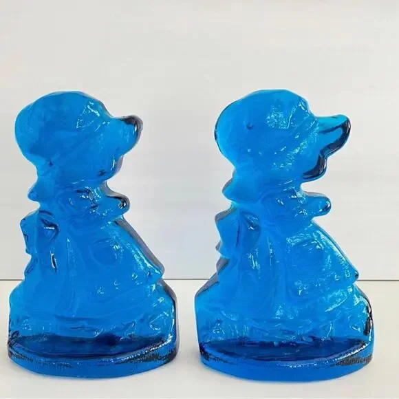 Vintage 1970's Pair Set Art Glass Blue Glass Girl w Bonnet Hat Holly Hobby Bookends Glass Figurine by L. E. SmithEach figurine measures approx. : 8" in height X 5.25" wide X 2.25" deep.Both figurines are identical. These are not marked.These were produced by L. E. SmithBoth are in overall good vintage condition.Much better looking person and sure to please.