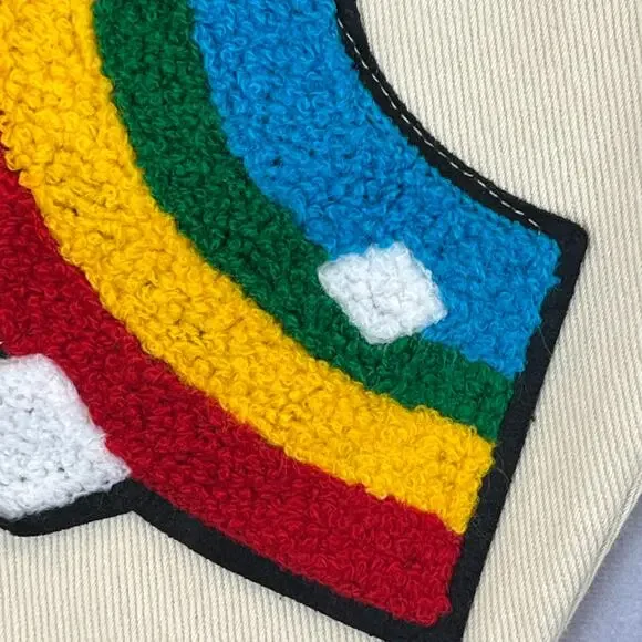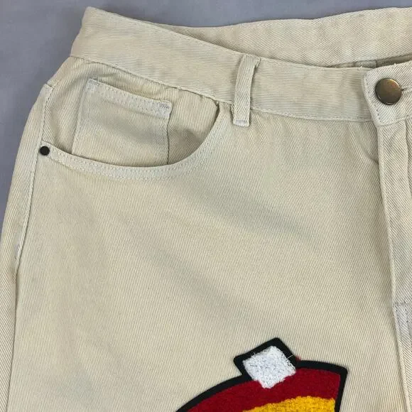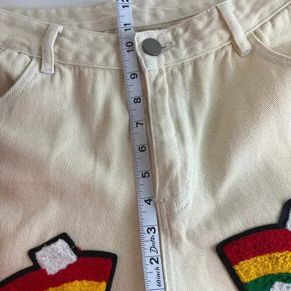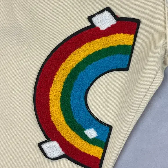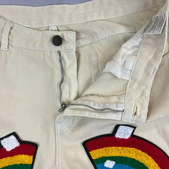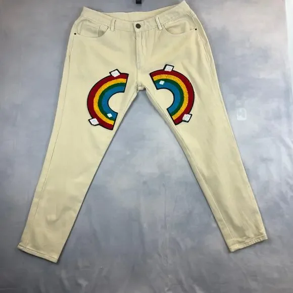 These unique cream-colored denim jeans feature a stylish rainbow patch accent, adding a fun and retro touch to your wardrobe. Made from 100% cotton, these mid-rise jeans offer a comfortable fit with a classic 5-pocket design. Perfect for casual wear, festivals, or vintage-inspired looks!Details:Size: 36x30 (See photos for exact measurements)Color: CreamMaterial: 100% CottonFit: Mid-rise, straight legFeatures:Rainbow patch detail for a unique style5-pocket design for functionalityButton and zipper fly closureClassic denim construction for durabilityBrand: UnknownCondition: Preowned, see photos for detailsA great find for those who love vintage, retro, and unique denim fashion!