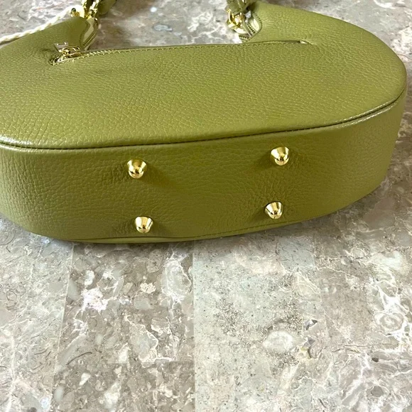 Beautiful Italian bag , convertible to the shoulder or crossbody with detachable adjustable approximately 52” strap fully extended and detachable handle bag , pebbled finish leather, gold tone hardware Moon Bag . 4 protective lags on the bottom, one front zipper pocket and two zipper pockets inside one with logo name on it , dust bag H9”W11”