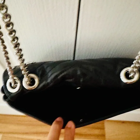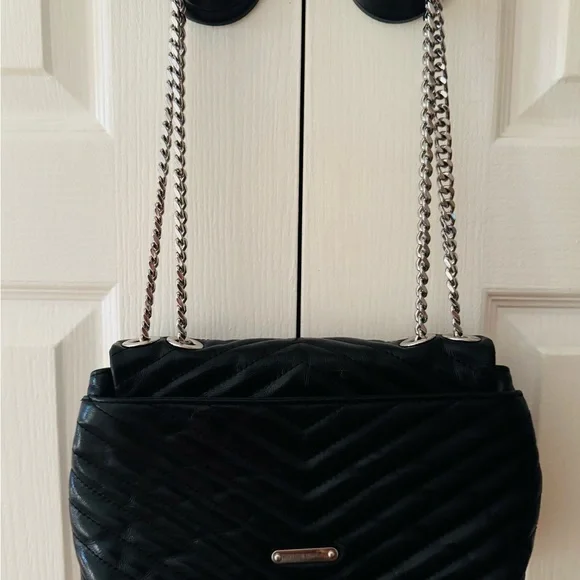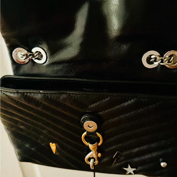 This stunning Edie crossbody from Rebecca Minkoff features celestial stud embellishments that add just the right touch of edge and sparkle. Crafted from 100% leather with a sleek black finish, it's perfect for day-to-night wear. The convertible chain strap allows you to wear it as a shoulder or crossbody bag with ease.Details:• Magnetic snap closure with outer slip pocket• Interior zip pocket for essentials• Dimensions: 10.37"W x 6.5"H x 2.3"D• Strap drop: 21"• Weight: 1.61 lbs• Leather exterior, polvester liningThis bag is in excellent condition - no visible wear, stored carefully in a smoke-free home. A chic, modern classic that will elevate any outfit.