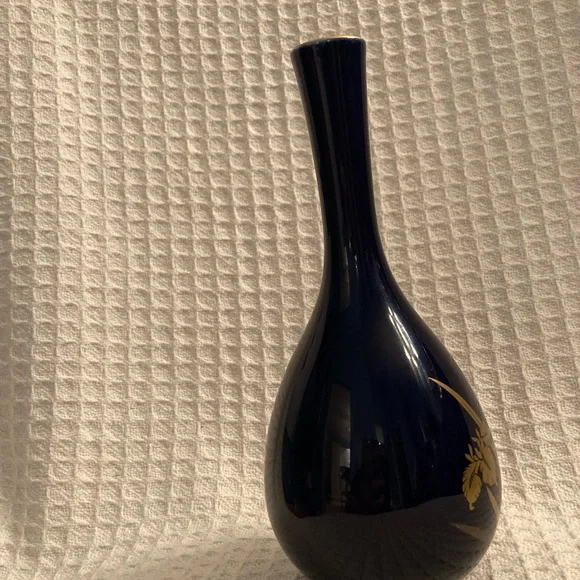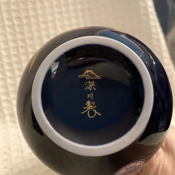 Lovely Fukagawa Porcelain Arita Japan cobalt blue vase with gold trim and accents. There are 2 Cranes and an Iris with leaves on the front. The interior is white and there is a gold band around the rim. Original foil sticker is still on the vase. Approximately 9” X 4”. Excellent used condition with some scuffs on the cranes.