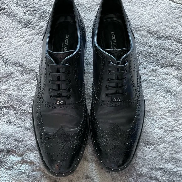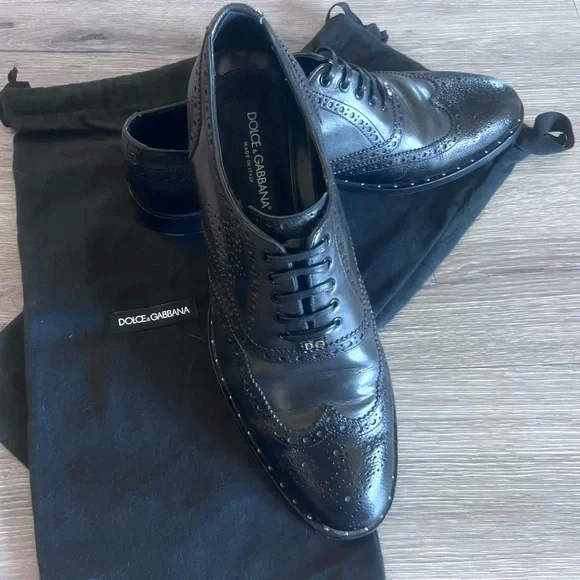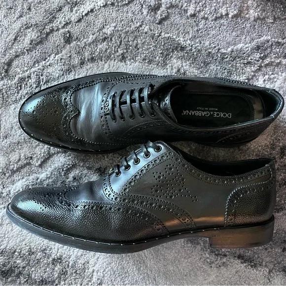 Black formal leather brogues from Dolce & Gabbana featuring a front lace up detail, a brand embossed insole, a pebbled leather texture and stitched panels.Barely worn and in excellent condition. Includes dust bag. Men’s size 7 1/2 but runs big. For reference: My husband typically wears a size 9 1/2 running shoe, a size 8 in LV, and a size 9 in Zegna if you are familiar with how these fit.