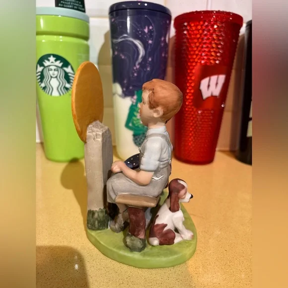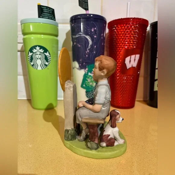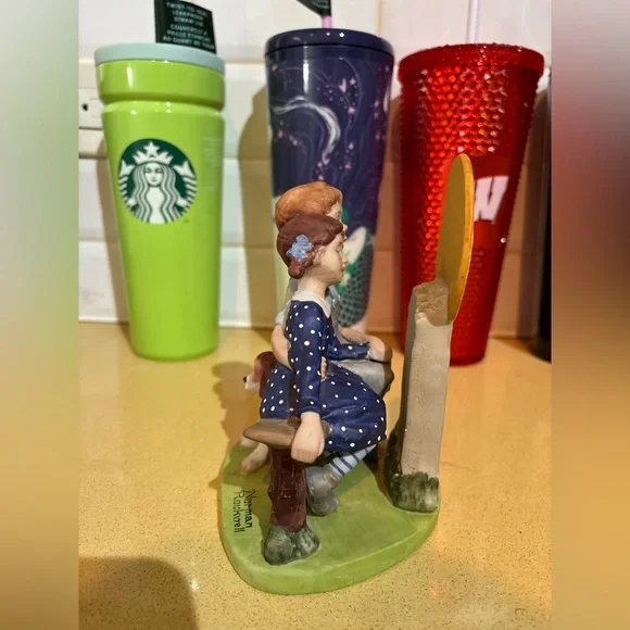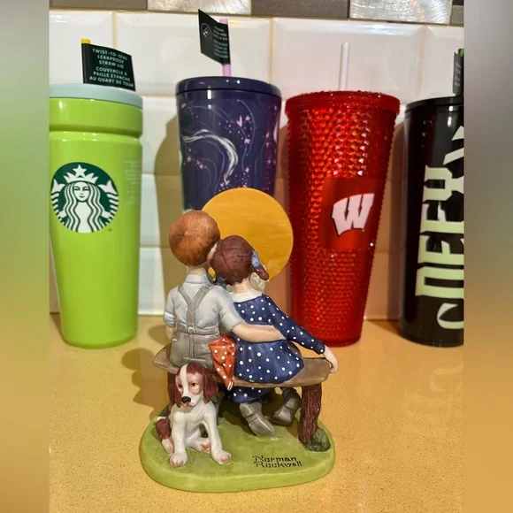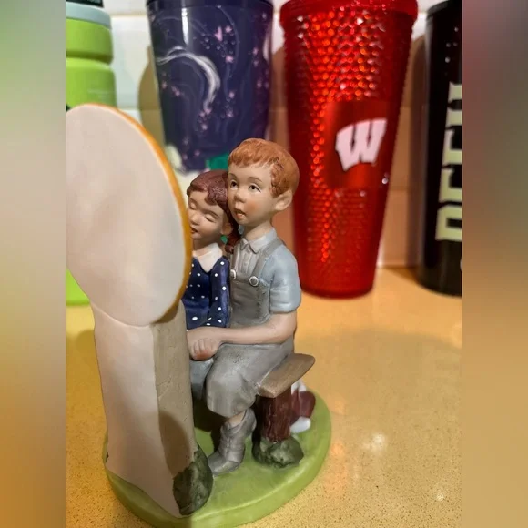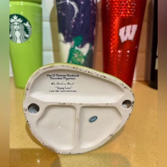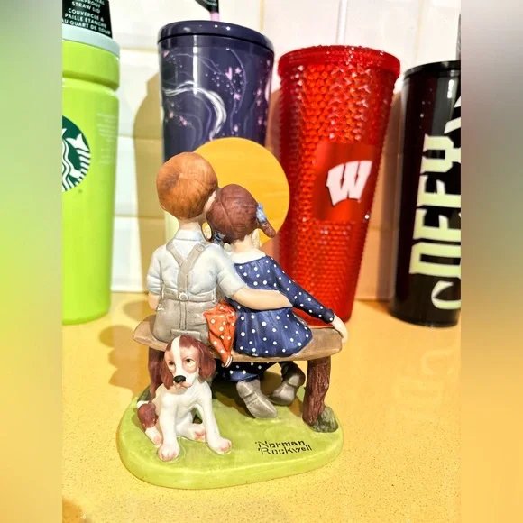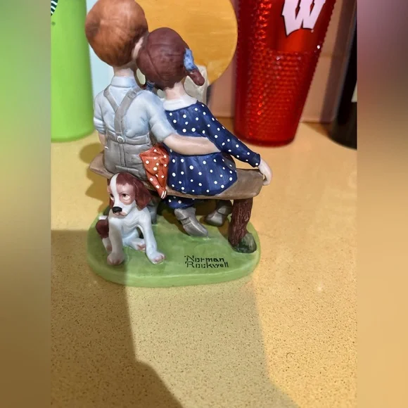 This sweet and timeless Norman Rockwell “Young Love” figurine captures that unforgettable first-crush feeling. Handcrafted in Japan and part of the original 1980 collection of 12 Rockwell figurines, this piece brings warmth, nostalgia, and a storybook charm to any space.Seated on a bench beneath a soft moonlit glow, the couple shares a quiet, heartfelt moment—with a little pup adding the perfect touch of innocence. Whether you’re a Rockwell collector, vintage decor lover, or just want a sentimental gift with meaning—this figurine is a treasure.⸻Why This Piece is a Must-Have:• Original 1980 Norman Rockwell release – stamped and handcrafted in Japan• Perfect condition – clean, vibrant, and full of life• Highly collectible – part of the iconic “The 12 Figurines of Norman Rockwell” set• Heartwarming design – ideal for gifting, vintage displays, or storytelling decor• Shelf or mantle ready – adds emotional warmth to any room⸻Whoever ends up with this piece? They’re getting more than a figurine—they’re getting a memory and a rare vintage collectible.