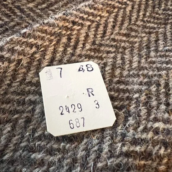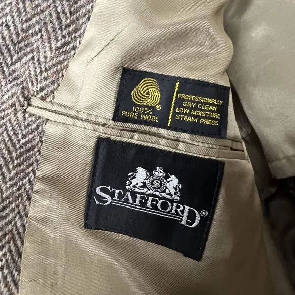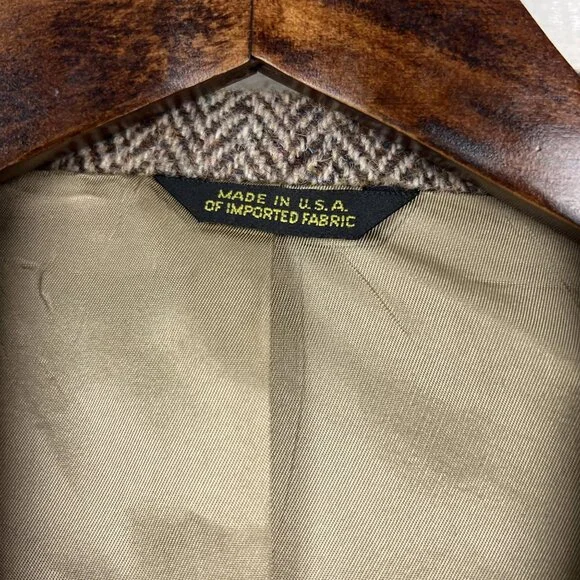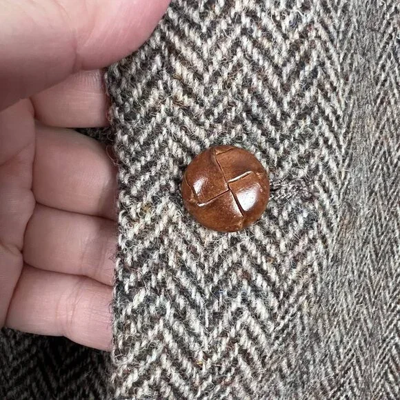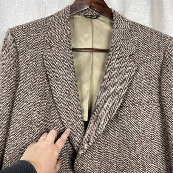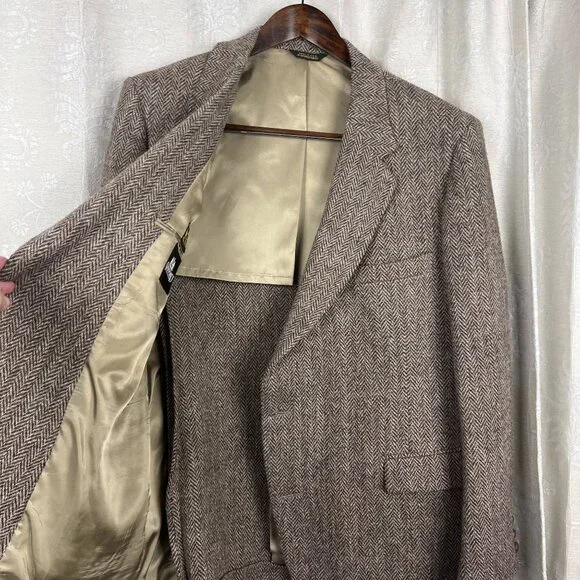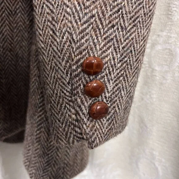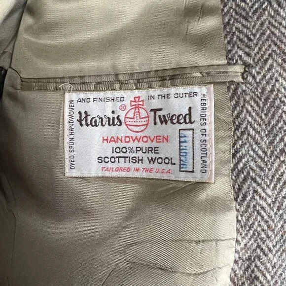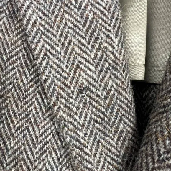Harris Tweed vintage chevron brown wool blazer by Stafford, size 48R.Two-button single-breasted sport coat in 100% wool.Harris Tweed fabric is "Dyed, spun, handwoven, and finished in the outer Hebrides of Scotland; Handwoven 100% Pure Scottish Wool"Made in the USALeather-wrapped buttons Notch lapelFlap pocketsSingle vent at back3 buttons at cuffsBrown herringbone tweed pattern Partially lined with inner pockets, no stretch.Condition: Small area of lapel that appears to have been mended, see photos. Otherwise in excellent vintage condition.See last photo for approximate measurements. All measurements are taken with garment laid flat.