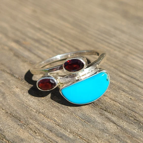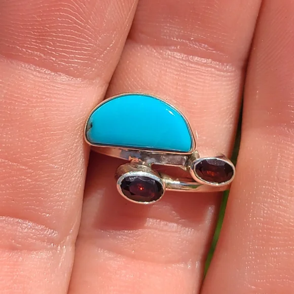 ~Turquoise - Nevada Aztec Mountain & Garnet 925 Ring~Beautifully handcrafted artisan jewelry made with solid 925 Sterling Silver & natural gemstones ❤️ Main Stone: Turquoise - Nevada Aztec Mountain & Garnet Metal Purity: Solid Sterling Silver, 925 parts per 1000Main Stone Creation: Natural GemstoneMain Stone Size: 6x12 mmRing Size: 6.5Weight (grams): 3.10💎💎Turquoise is a powerful stone of protection and truth, known to soothe the soul and calm turbulent emotions. It promotes clear communication from the heart, encourages self-expression, and is believed to align the chakras while fostering inner peace and spiritual grounding💎💎💎💎Garnet is a powerful stone of passion and vitality, igniting the life force and energizing the root chakra. It promotes courage, strength, and emotional balance💎💎🎁*Ask about bundle discounts*🎁Thank you for supporting me on my journey to spread beauty in wearable form! 💖 ~love & blessings~