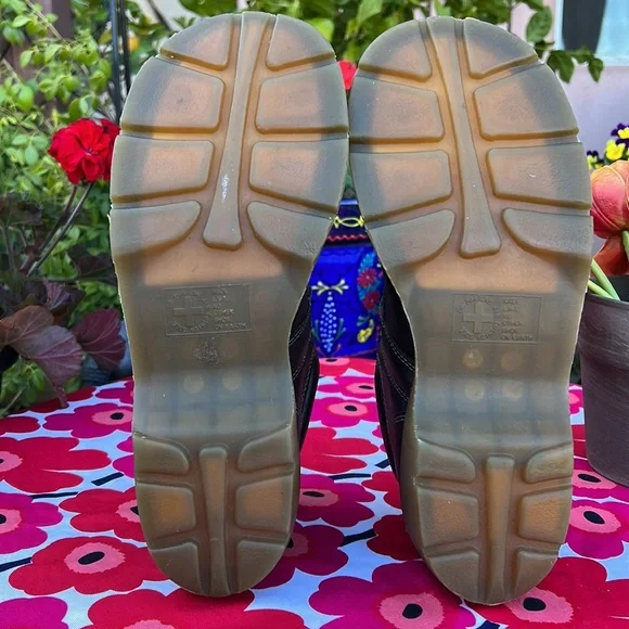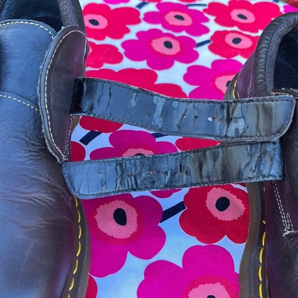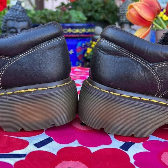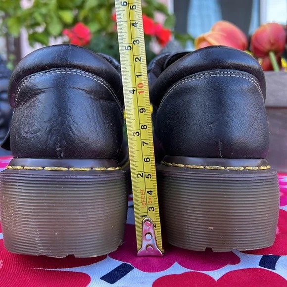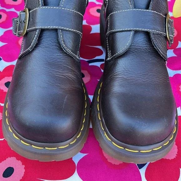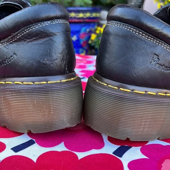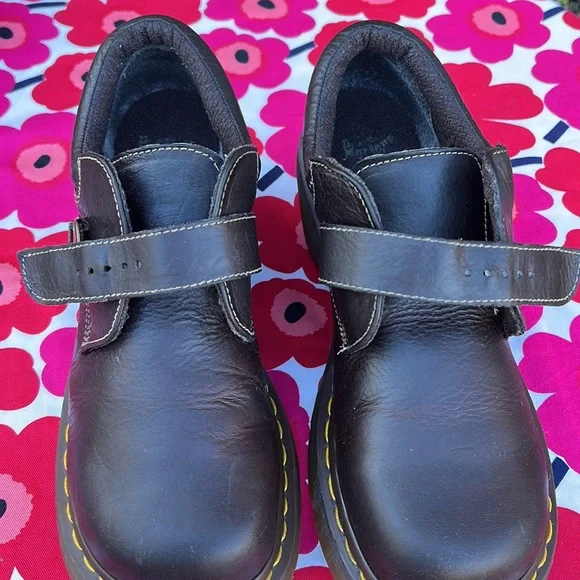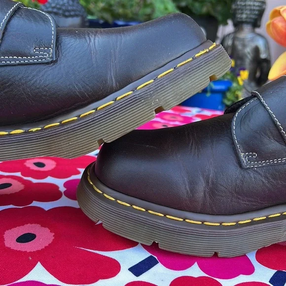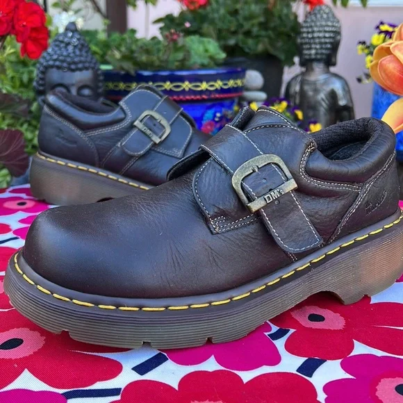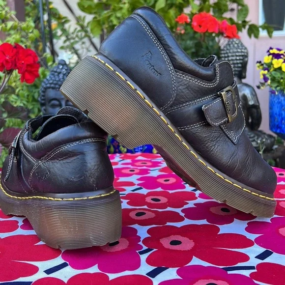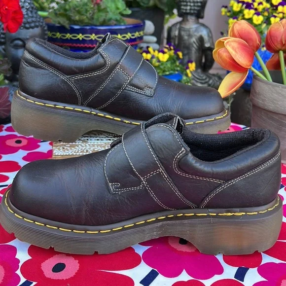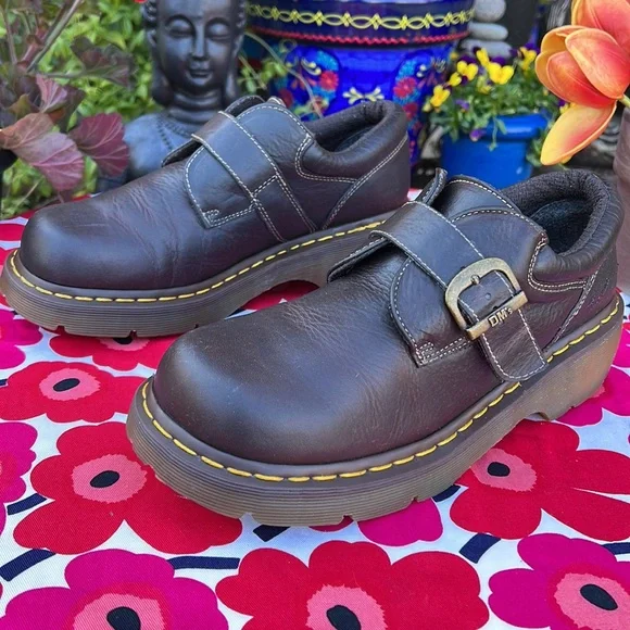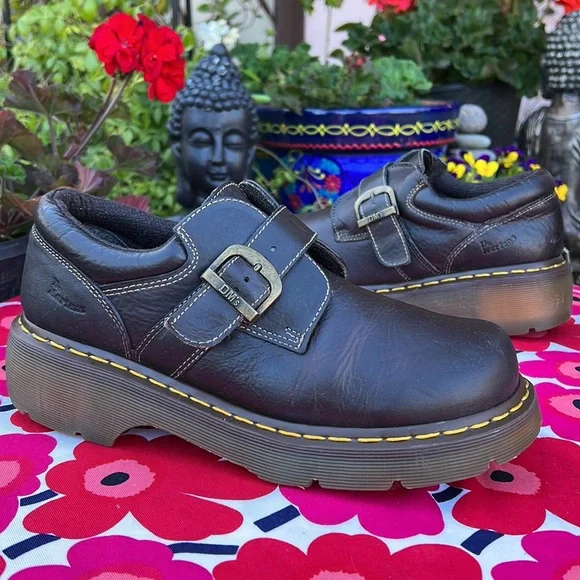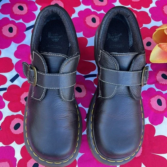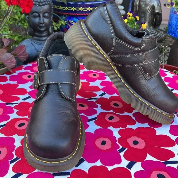 Dr. Martens Vintage Chunky Brown Monk Strap Loafers. Single strap with adjustable buckle. Chunky 2 1/2 inch soles. Lifted front. Round toe box. Cushiony ankle collar. Clean inside and out. Leather is soft and supple. A few scuffs here and there but nothing major. Some normal creasing. Strap looks great and hardly used on the outer side, but the inside has peeling. Loafers have recently been conditioned. Unisex sizing. Men’s size 9, women’s size 10, UK 8, EU 42.E22357 DM