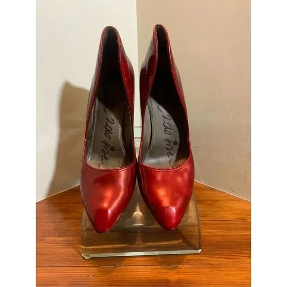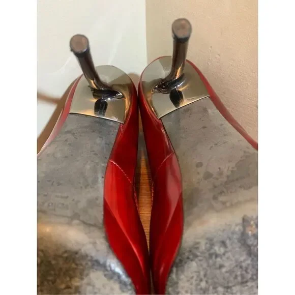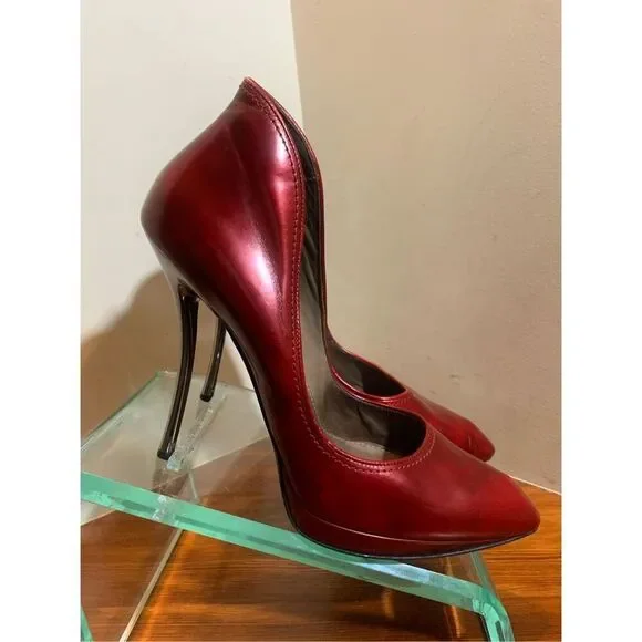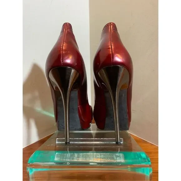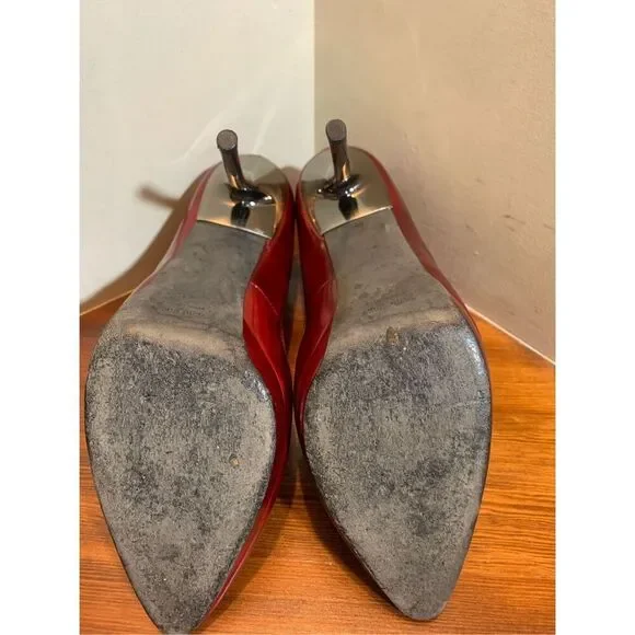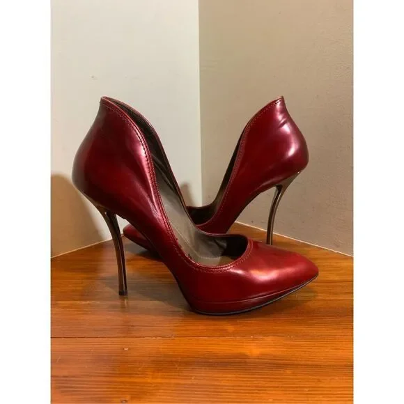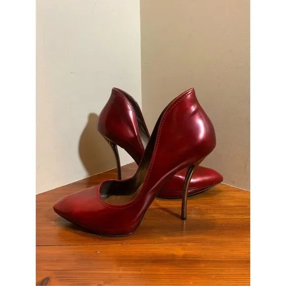 Lanvin Incredibly, almost abstract, profiled high heels by Lanvin from the catwalk collection.Overall Good Pre-Owned Condition, couple of scrapes on the toe see photos. May show some creasing or rubbing due to normal wear.Includes box, no dust bags.The upper is made of patent leather, a light metallic shade, if you look closely, it is not a solid color, but has light burgundy brush strokes.Almond toe, stiffened at the front, I don't know if it's leather or metal plate, but it shapes the entire front perfectly.