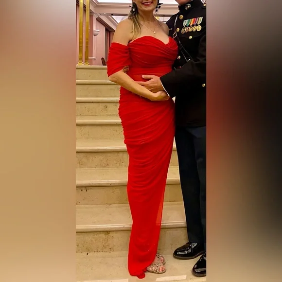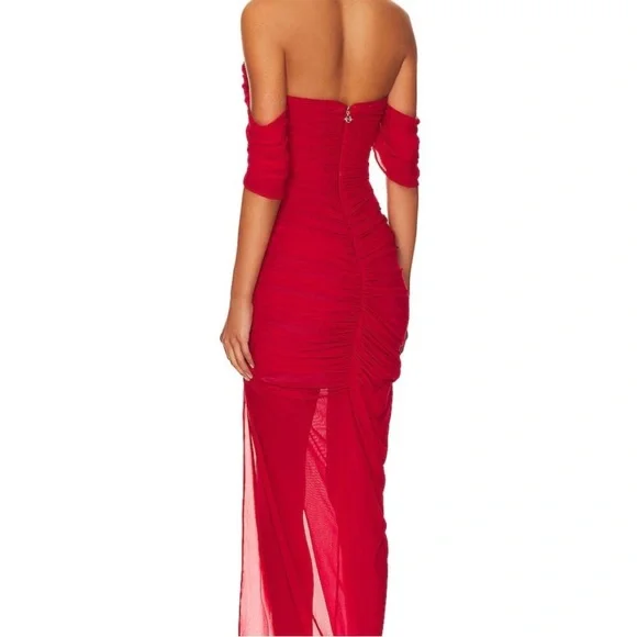 Fabulous NOOKIE brand Dita Dress in a bright red with a sweetheart neckline. Size L but fits a Medium perfect! Made of stretchy and supportive mesh that will hug your curves beautifully and is actually pregnancy friendly. A skin tone lining keeps you covered and supported inside and a high slit makes it easy to walk in. Worn once to a formal event. Retail was $400 plus shipping and tax.