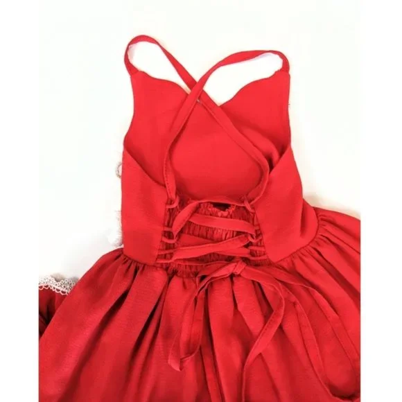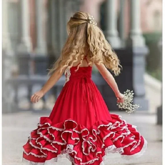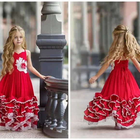In a gorgeous red, this design features an elasticated back bodice for a comfortable and stretchy fit and tie shoulder straps that can be tied accordingly. This floor-length design features a scallop neckline, a gorgeous flower applique on the waist surrounded by lace and ruffles on the bottom hem of the skirt with a delicate lace trim. Flower applique is included