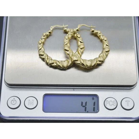 Do you want to be the center of the crowd? The Real 10K Yellow Gold 36.3mm Twisted Heart Diamond Cut 4.1gr Hoop Earrings will definitely bring a spark of color and luxe to your outfit and let the feminine design create a luxurious look effortlessly. These hoop earrings are perfect for you if you ever feel bored with colorless jewelry! Such advantages make it a more popular accessory.PRODUCT DETAILS:Metal: 10K solid Yellow GoldStamped: 10KMeasures: 36.3mmGram Weight: 4.1 gramsMetal DetailsType - 10k solid gold