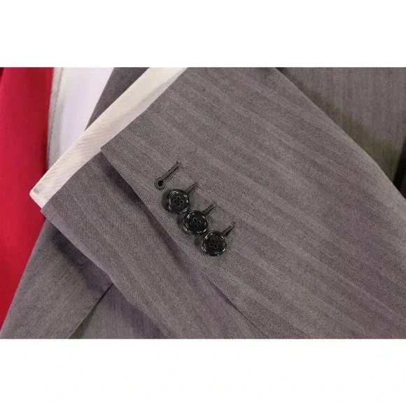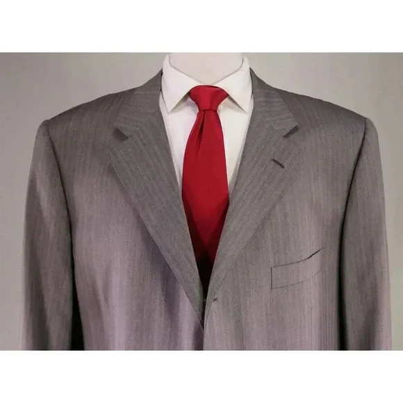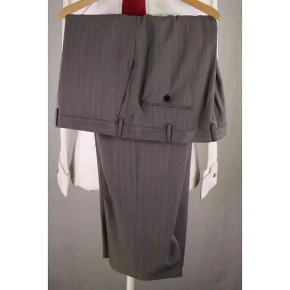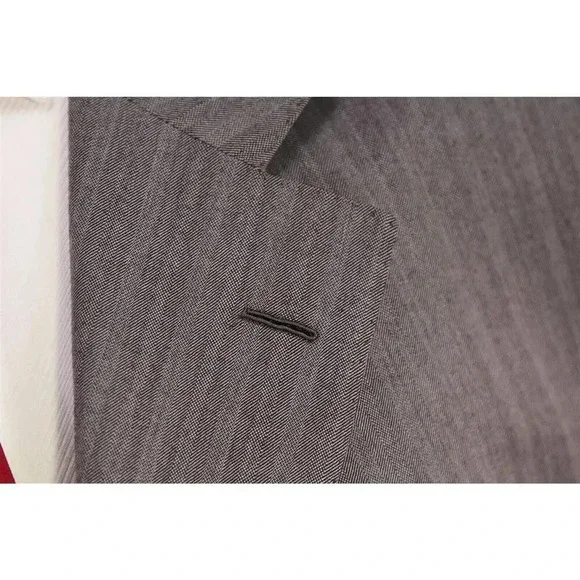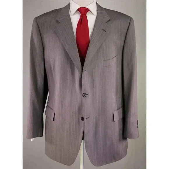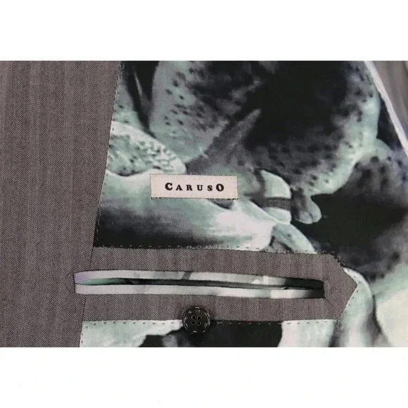 Brand: Raffaele Caruso * Size: US 52R . Please follow my measurements * Measurements (Laying flat, Unstretched):Jacket:Underarm to Underarm on back: 26.5 inchesLength on back(from under the collar): 31.5 inchesWaist (at the middle/top button): 26 inchesShoulder to shoulder: 20 inchesSleeves from shoulder seam to end of cuff: 26 inchesExtra material to sleeves: 1.5 inchesPants:Pants Waist: 46 InchesExtra material on waist: 3 InchesPants Rise: 13 Inches (Measurement between the waistline and the crotch)Pants inseam: 28 InchesExtra material on inseam: 2.25 InchesOpening at hem: 10 inches* Material: 100% Super 180's Wool Weight: Medium to Light Weight* Color: Gray* Design: Tonestripes* Jacket:Three Button Single Breasted - could also be a 3/2 rolled lapelDual VentFour Interior PocketsThree Exterior PocketsFour Working Buttons on the cuffsFully Lined in custom silk lining* Slacks:Flat FrontUncuffed HemsSlanted Front PocketsLined to the kneesTwo Back Pockets* Made in Italy* Condition: Like new. Gently Used. No stains or tears.* Inventory Code #S14110Powered by SixBit's eCommerce Solution