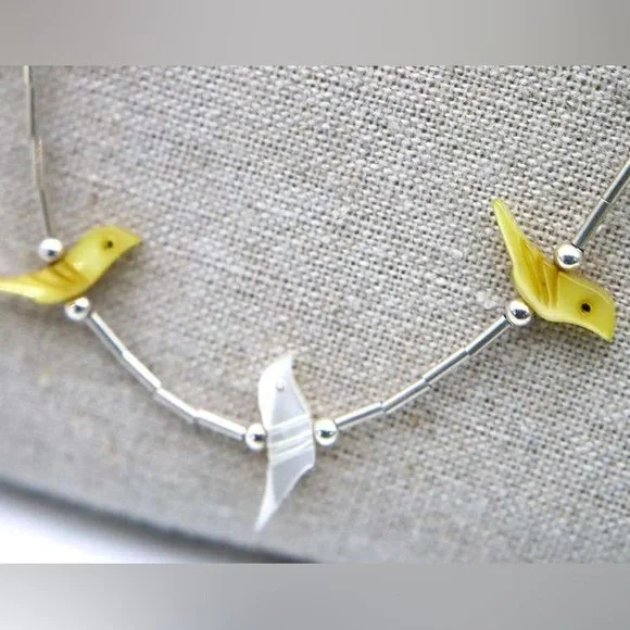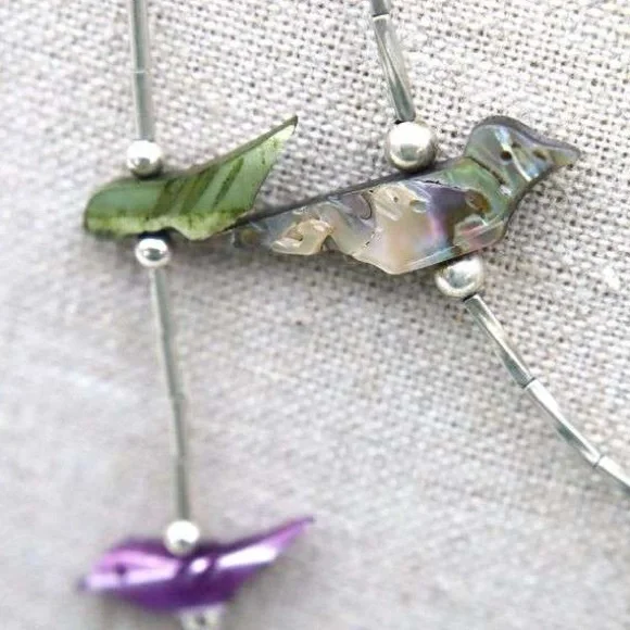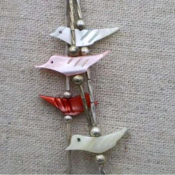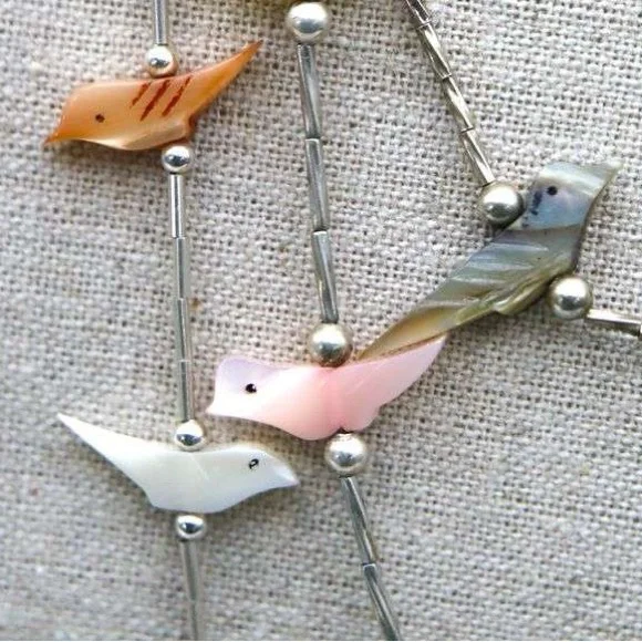 This stunning vintage Zuni fetish necklace features a beautifully handcrafted design with hand-carved gemstone birds, symbolizing protection, guidance, and connection to nature. Each bird is intricately carved from a variety of natural stones, strung on fine sterling silver beads for an elegant yet earthy look.💎 Key Features:•Authentic Zuni Fetish Necklace•Hand-Carved Multicolor Gemstone Birds•Sterling Silver Beads & Findings•Long, Layered Bohemian Design•Native American Artisan Craftsmanship✨ Perfect for collectors, Southwest jewelry lovers, or as a unique boho statement piece. A meaningful and one-of-a-kind gift for any occasion!💖 Shop now at Stella Maris Atelier and own a piece of Native American artistry!